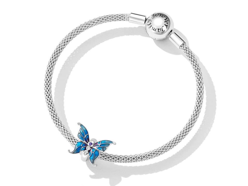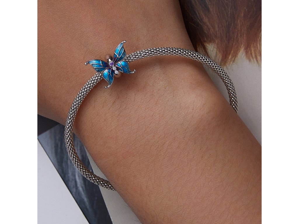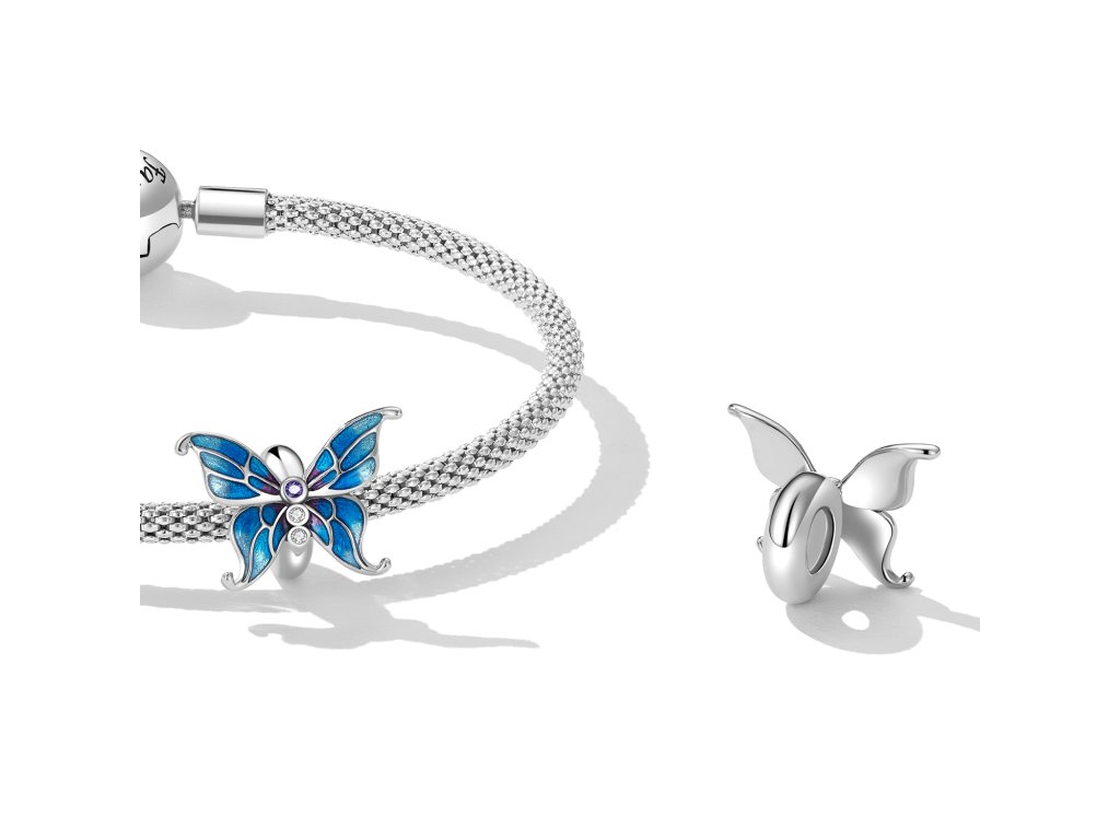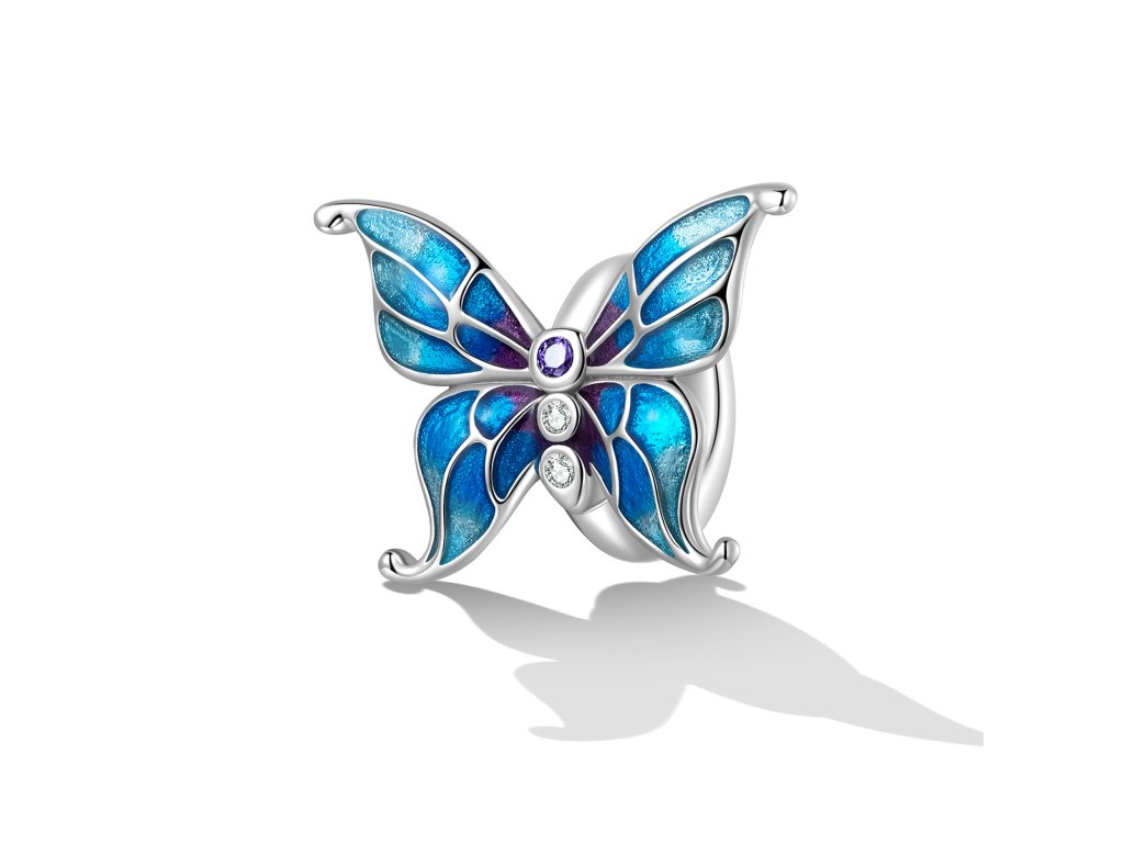 - Strieborný prívesok / spacer na náramok v dizajne krásneho motýľa zdobeného tromi zirkónmi a glazúrovanými odtieňmi modrej a fialovej farby. Spacer je opatrený vnútornou gumičkou, vďaka ktorej prívesok drží na náramku na svojom mieste. Originálny design prívesku, kvalitné spracovanie a materiál, ručne dohotovené.