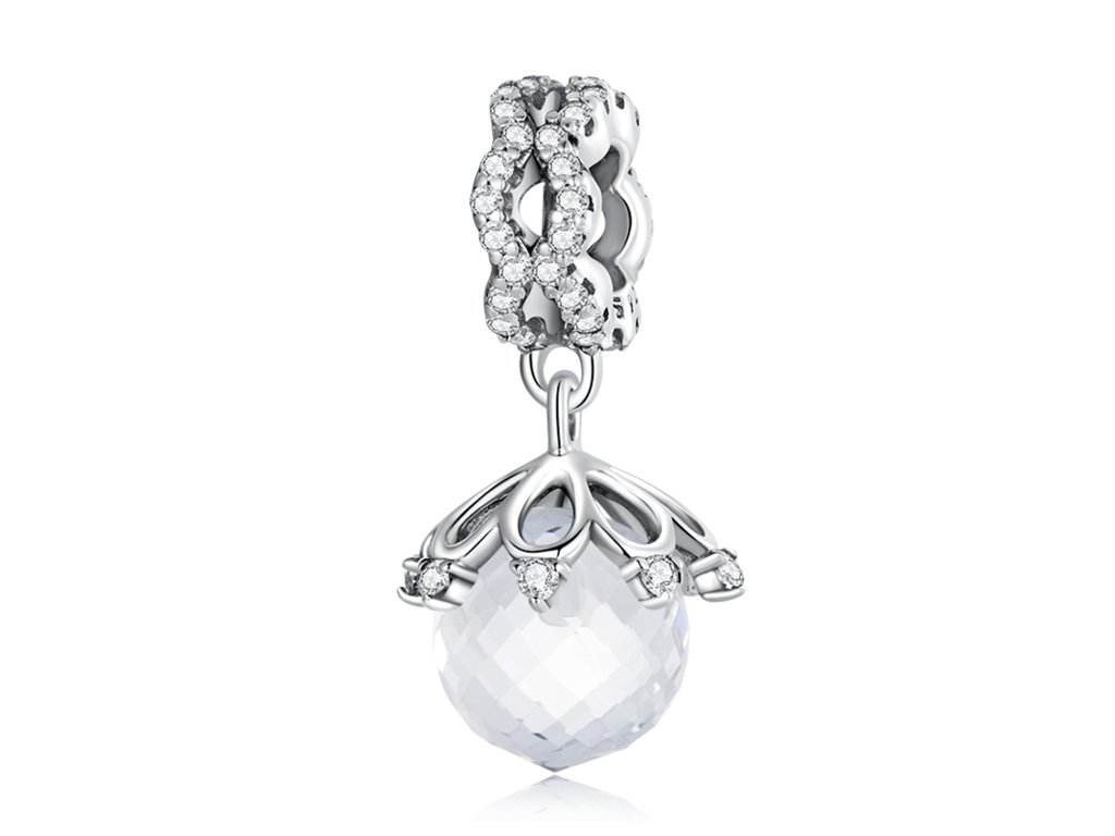 - Strieborný visiaci elegantný prívesok zdobený čírymi trblietavými zirkónmi a veľkým priezračným brúseným sklom v tvare gule. Originálny design prívesku, kvalitné spracovanie a materiál, ručne dohotovené.