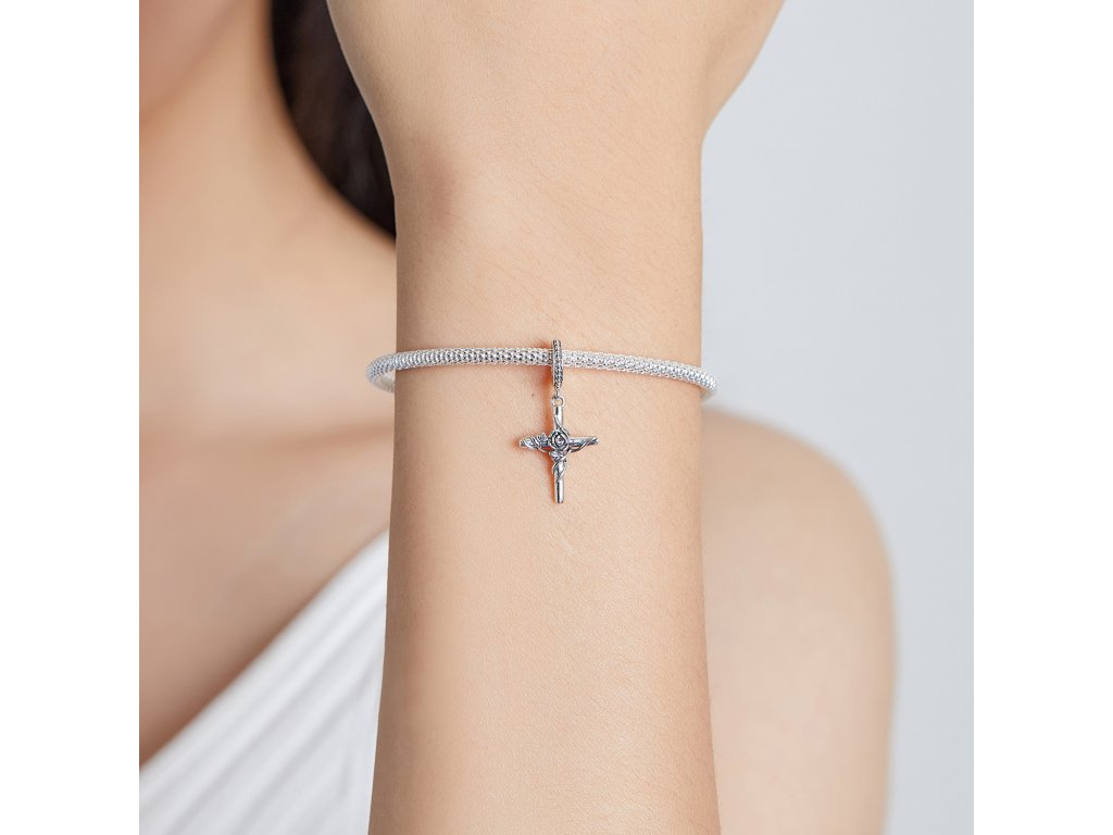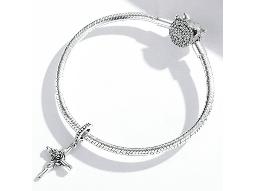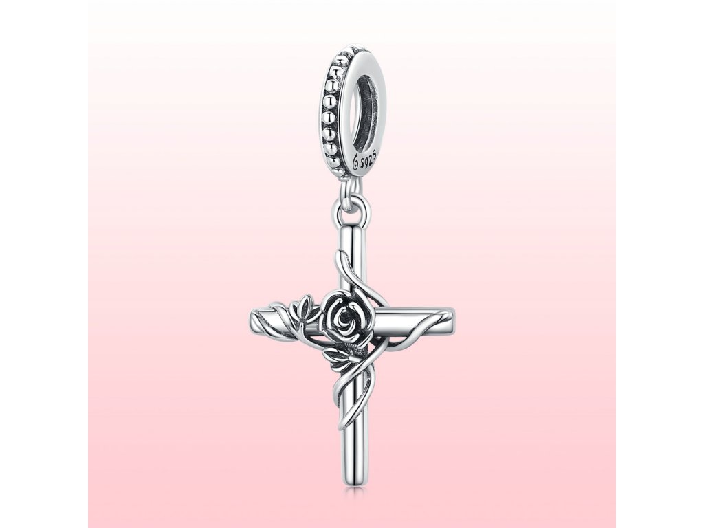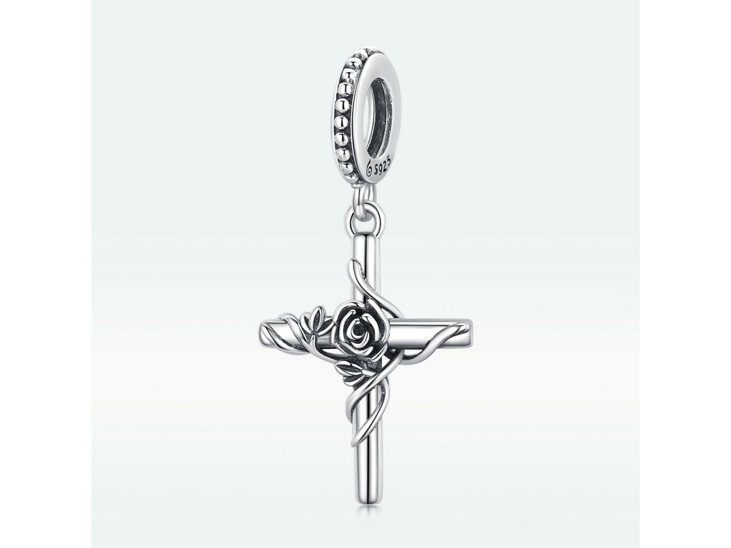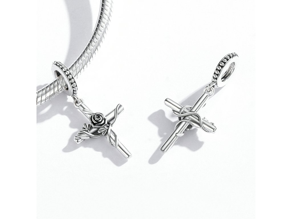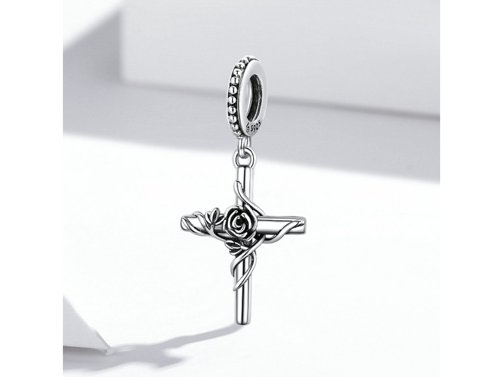 - Strieborný visiaci prívesok v dizajne kríža zdobeného rozkvitnutou ružou. Originálny design prívesku, kvalitné spracovanie a materiál, ručne dohotovené.