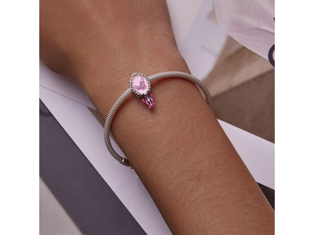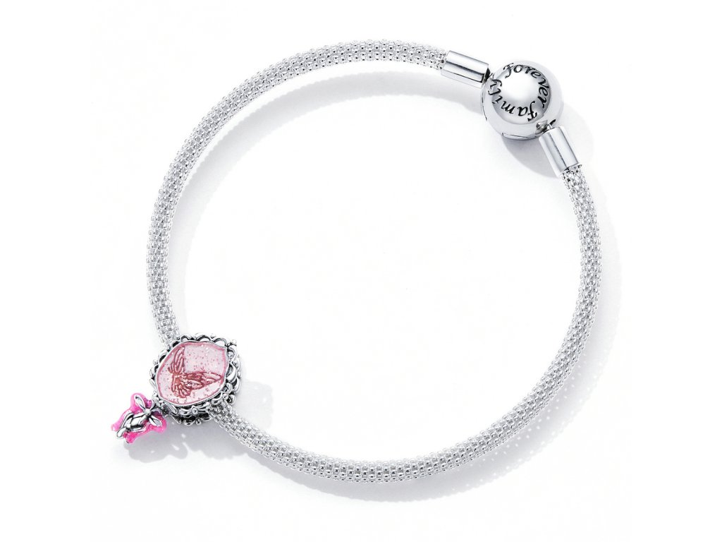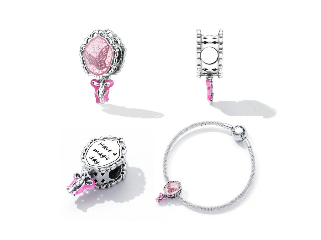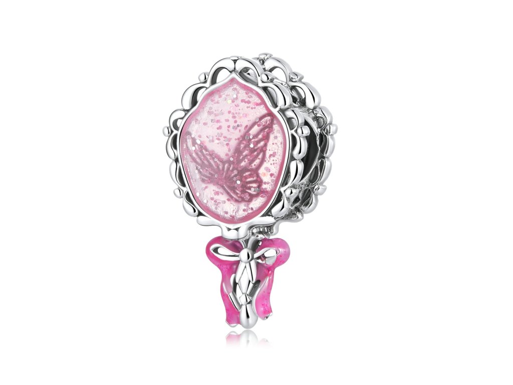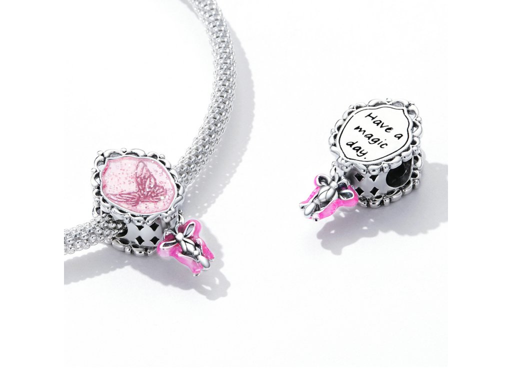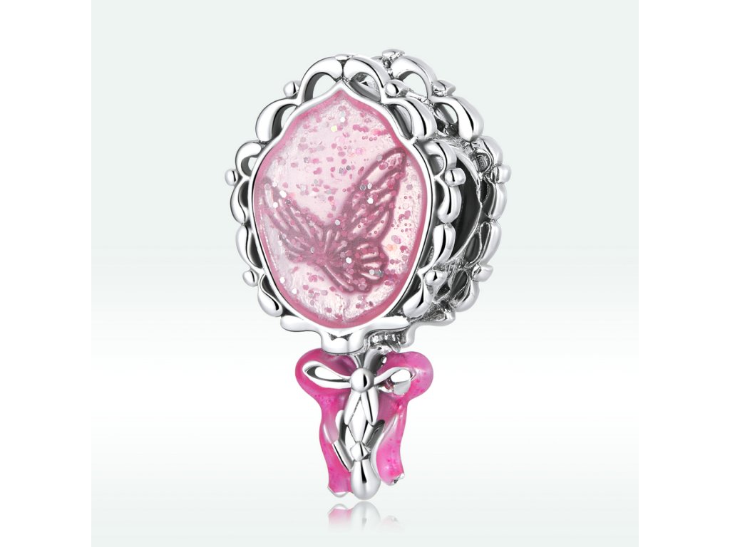 - Strieborný prívesok v dizajne kúzelného zrkadla s motýlikom a mašľou zdobený ručne nanášanou ružovou glazúrou. Zadná strana prívesku je obohatená anglickým nápisom "Have a magic day" v preklade "Môj kúzelný deň". Prívesok je tiež zdobený dekoračnými výrezmi po stranách. Originálny design prívesku, kvalitné spracovanie a materiál, ručne dohotovené.