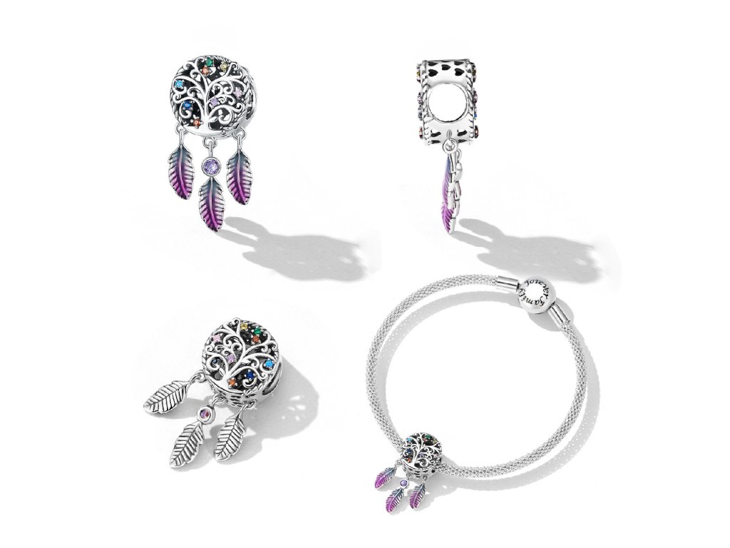 - Strieborný prívesok v dizajne krásneho spirituálneho lapača snov zdobeného farebnými trblietavými zirkónmi a ručne nanášanou fialovou glazúrou. Prívesok je tiež obohatený vyrezávanými milovanými srdiečkami po stranách. Originálny design prívesku, kvalitné spracovanie a materiál, ručne dohotovené.