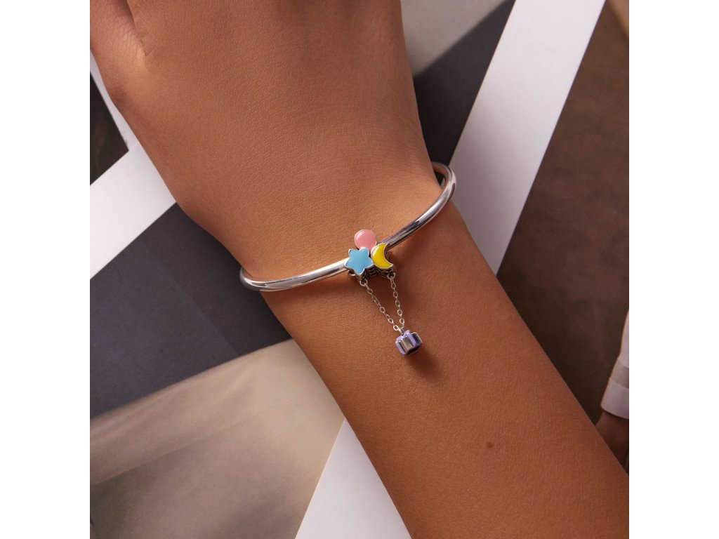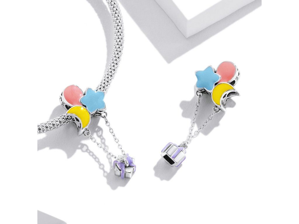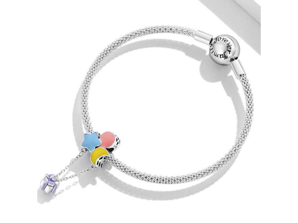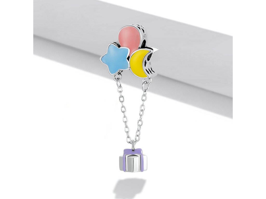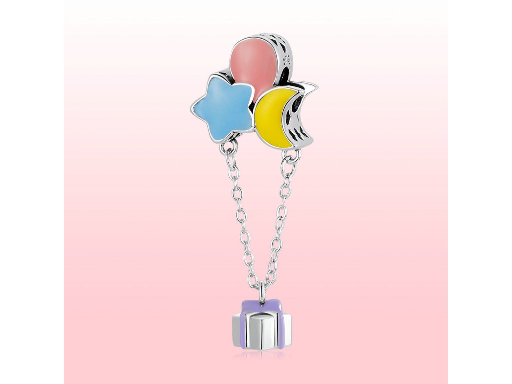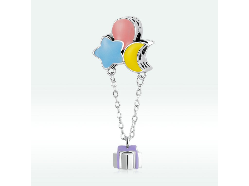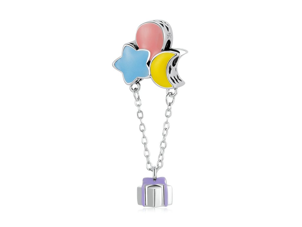 - Strieborný prívesok v dizajne lietajúceho balóna s darčekom zdobeného ručne nanášanou farebnou glazúrou. Prívesok je tiež obohatený ručne vyrezávanými milovanými srdiečkami po stranách. Originálny design prívesku, kvalitné spracovanie a materiál, ručne dohotovené.