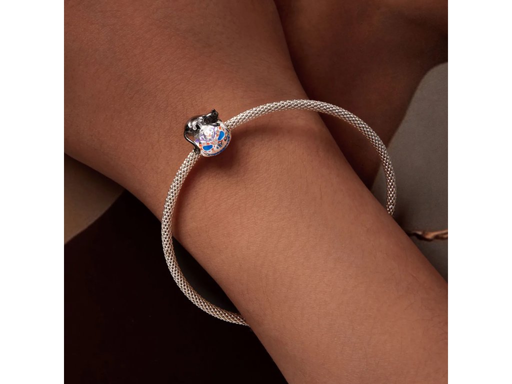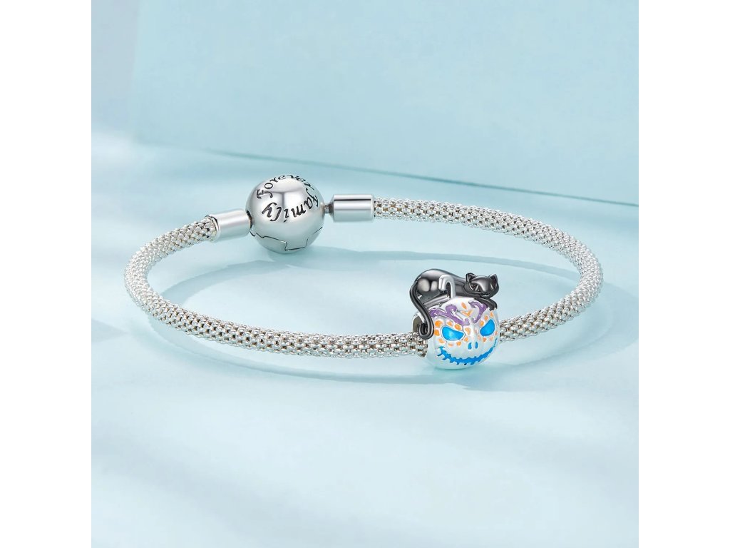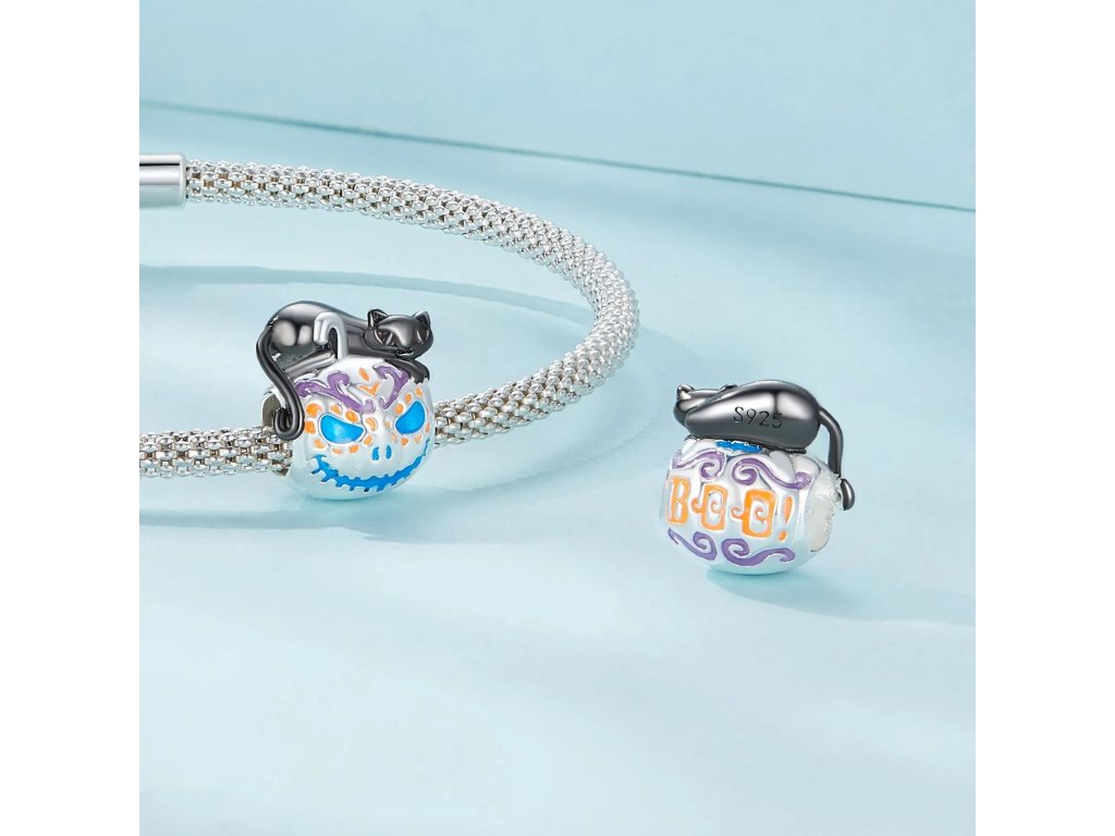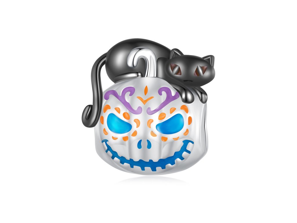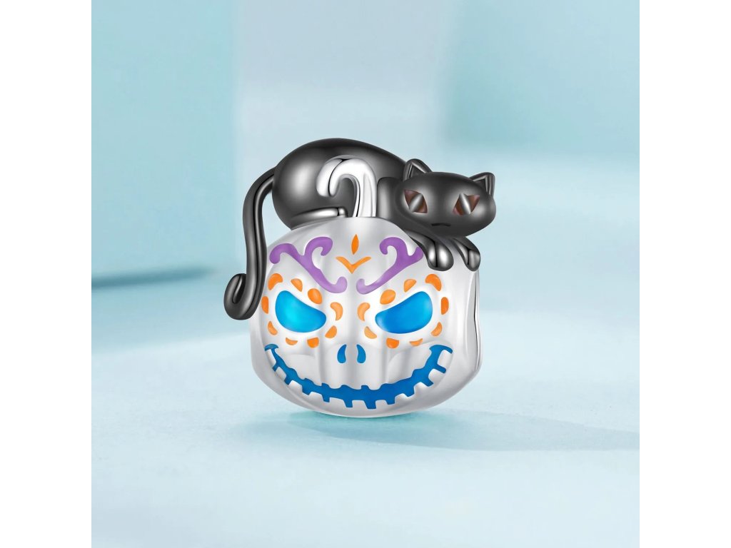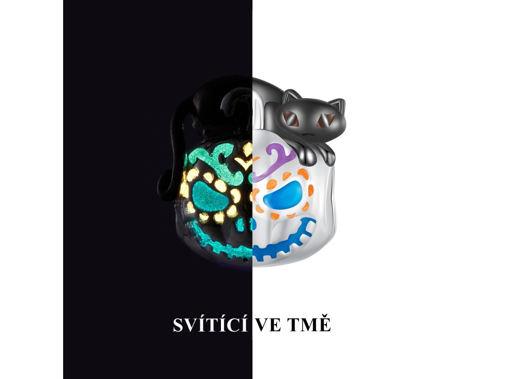 - Strieborný prívesok z kolekcie Halloween. Prívesok v dizajne tekvice s mačkou detailne zdobený ručne nanášanou farebnou glazúrou svietiacou v tme.