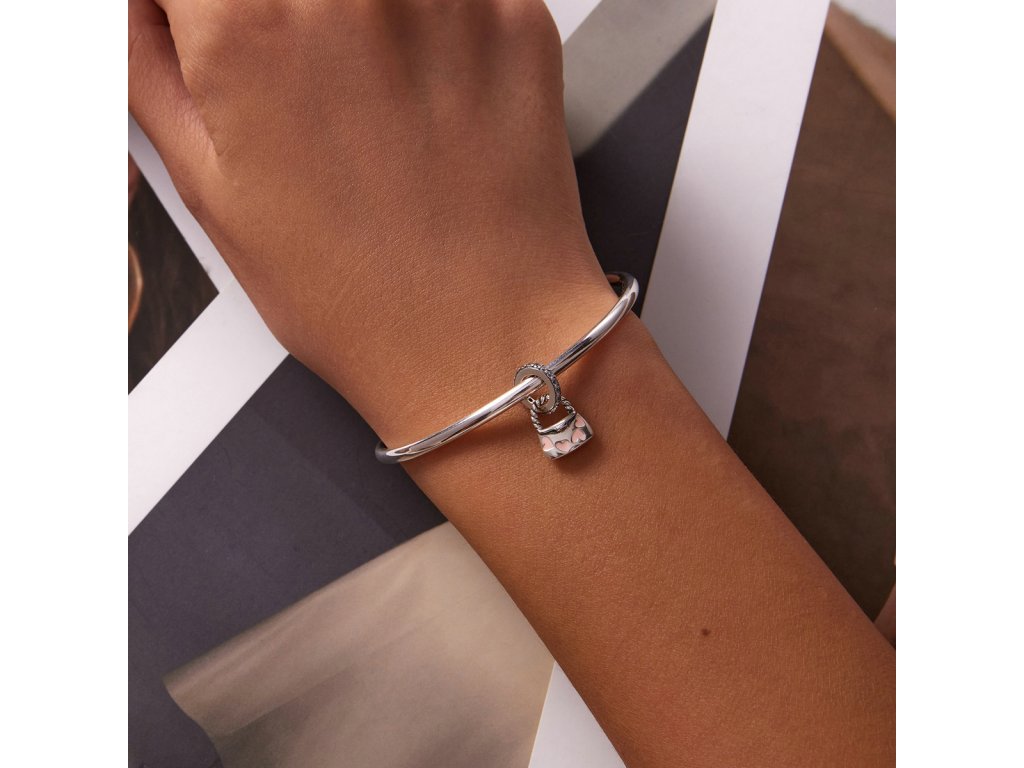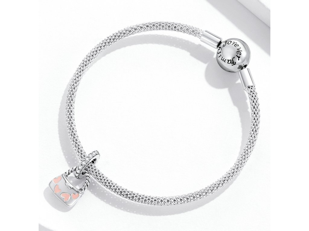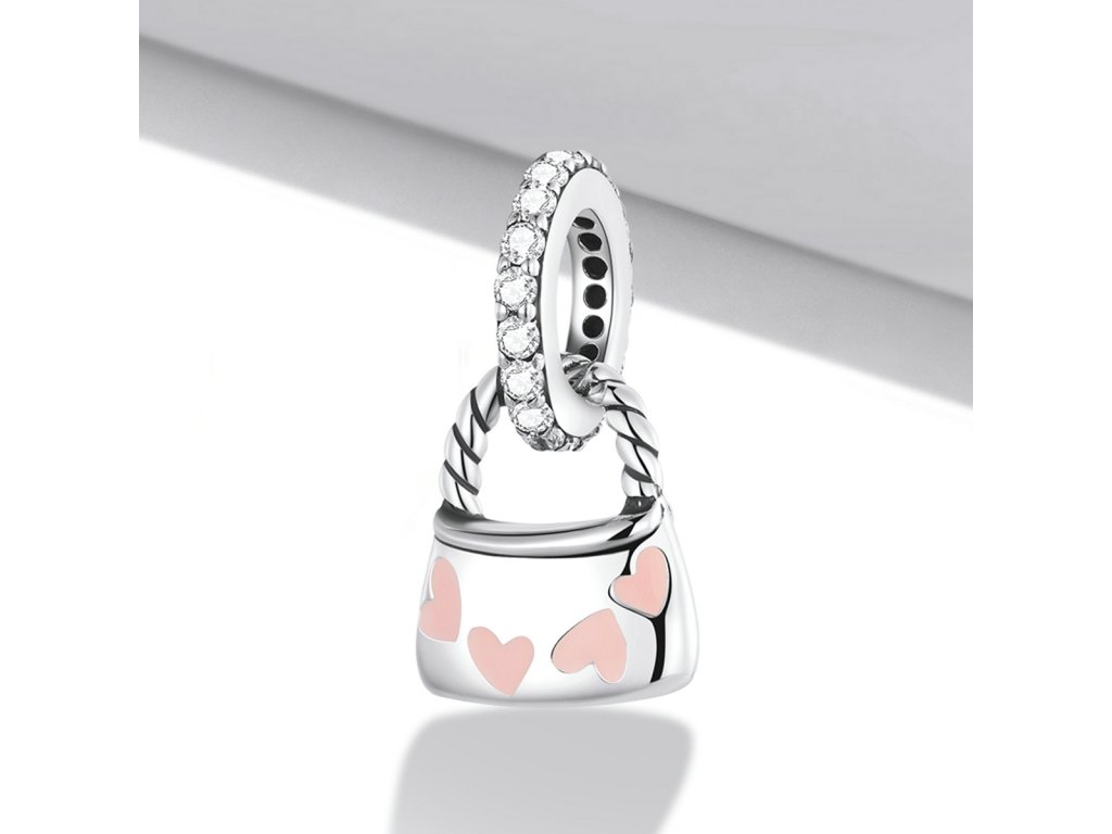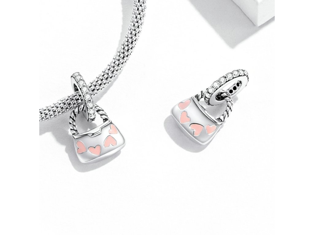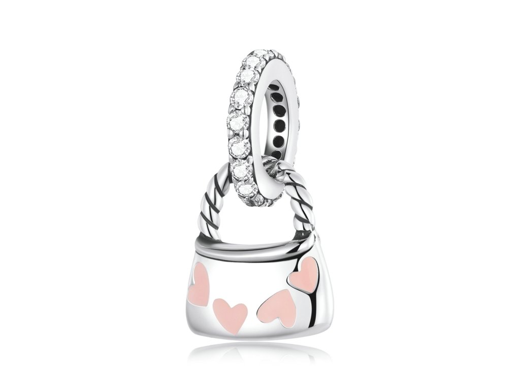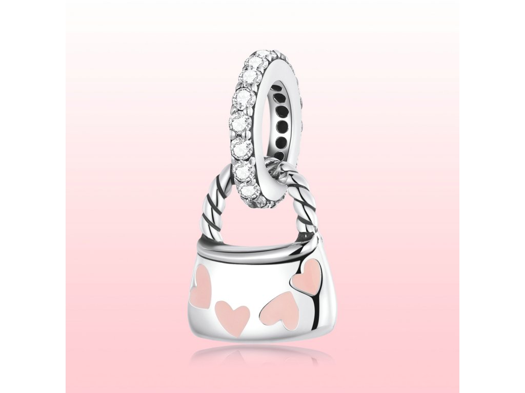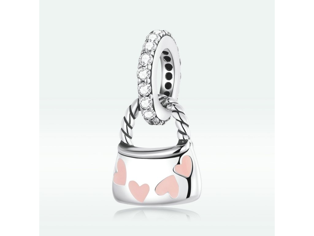 - Strieborný visiaci prívesok v dizajne milovanej kabelky zdobenej srdiečkami tvorenými ručne nanášanou ružovou glazúrou. Prívesok je tiež obohatený radom čírych trblietavých zirkónov. Originálny design prívesku, kvalitné spracovanie a materiál, ručne dohotovené.