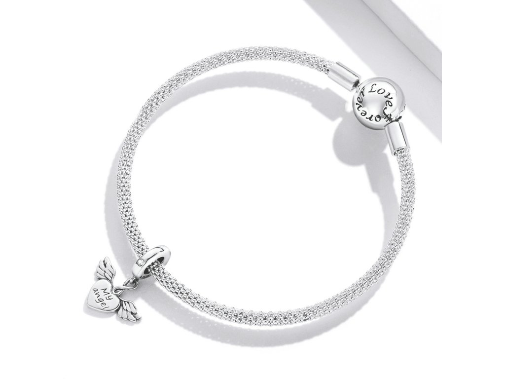 - Strieborný visiaci prívesok v tvare srdca zdobený anjelskými krídlami a anglickým nápisom "My anjel" v preklade "Môj anjel". Prívesok tiež zdobí symbol nekonečna a číry trblietavý kameň v podobe zirkónu. Originálny design prívesku, kvalitné spracovanie a materiál, ručne dohotovené.