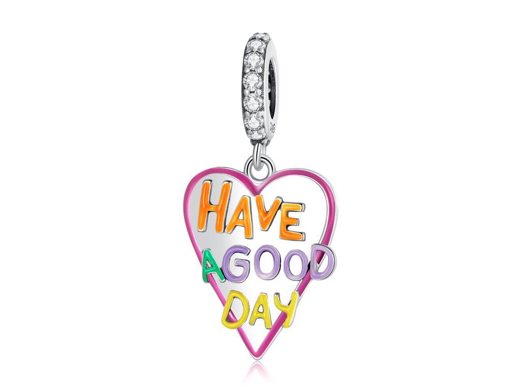 - Strieborný visiaci prívesok v tvare srdca zdobený čírymi zirkónmi a ručne nanášanou glazúrou s nápisom "Have a good day" v preklade "Môj pekný deň". Originálny design prívesku, kvalitné spracovanie a materiál, ručne dohotovené.