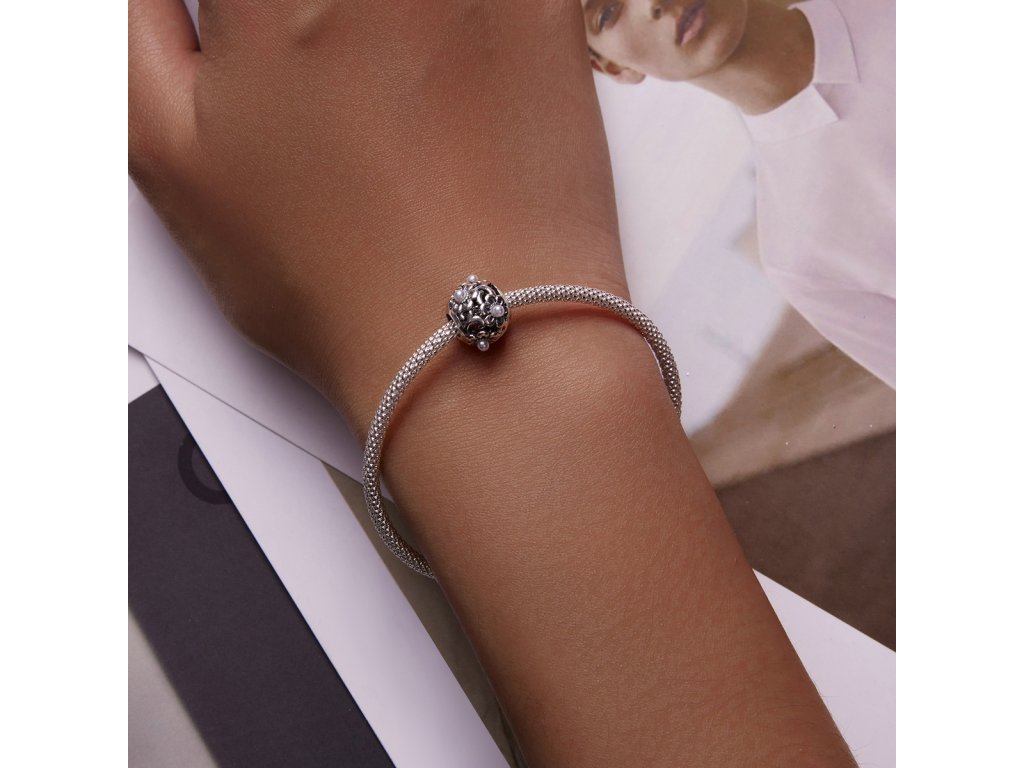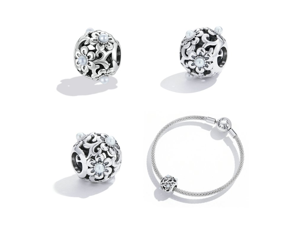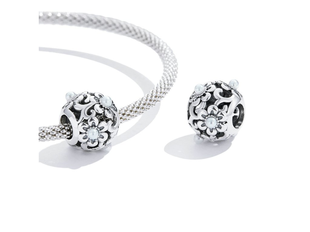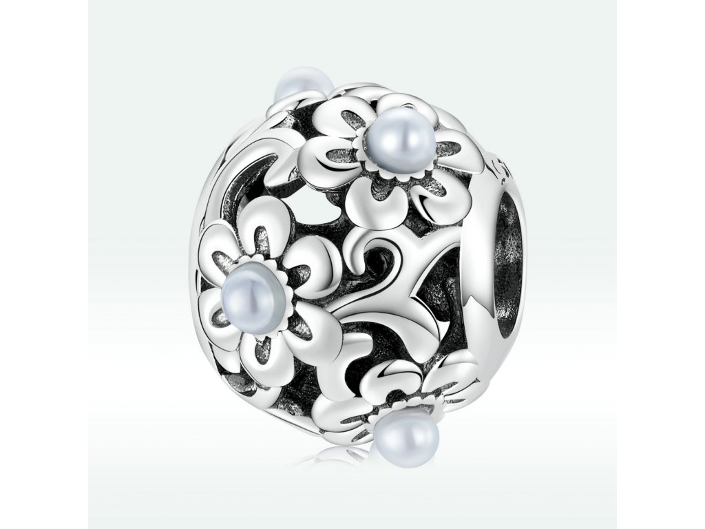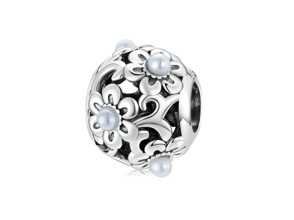 - Strieborný prívesok / korálik v dizajne krásnych kvetov zdobených jemnými perlami. Originálny design prívesku, kvalitné spracovanie a materiál, ručne dohotovené.