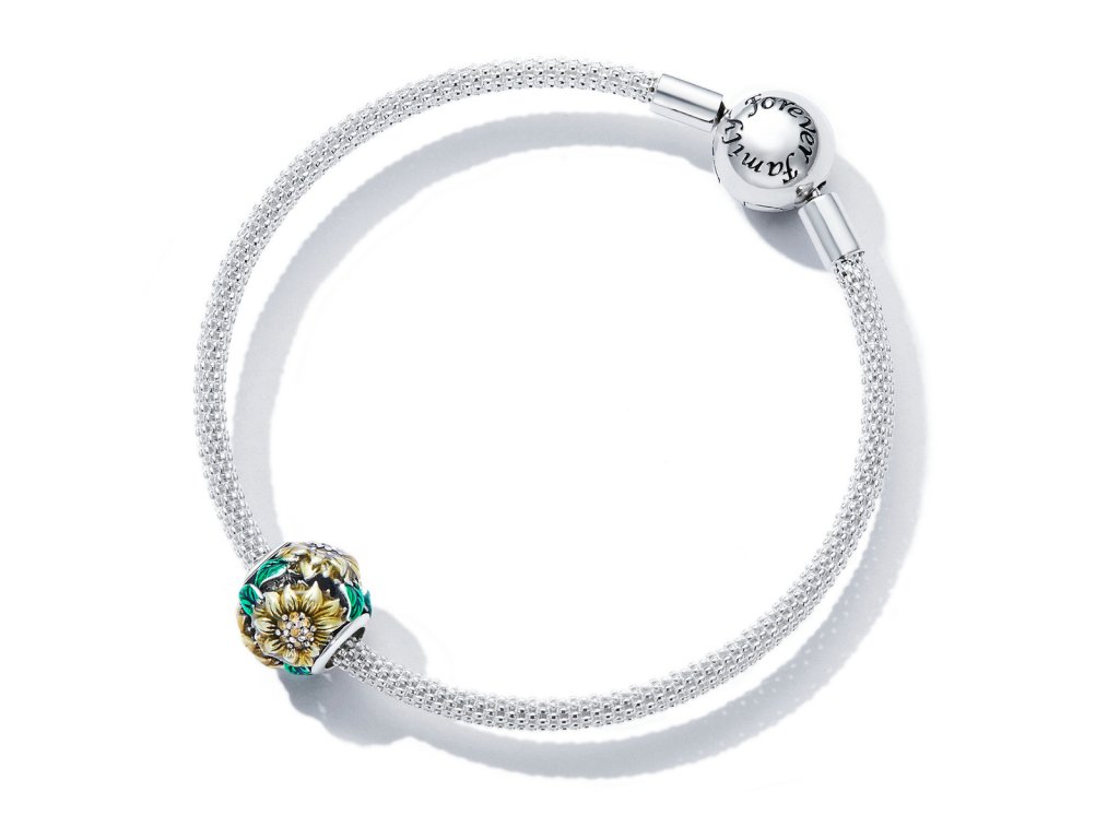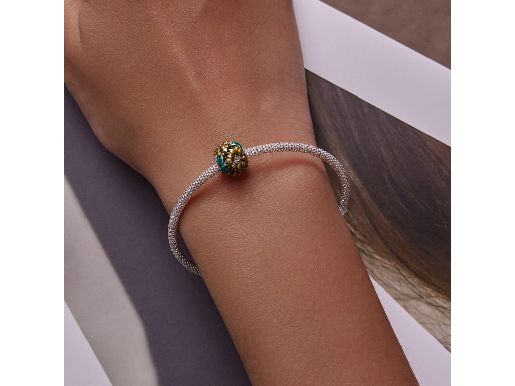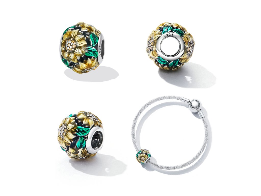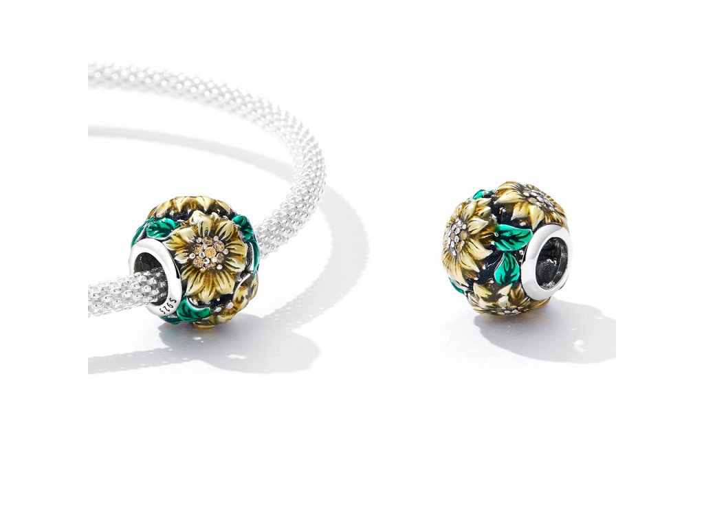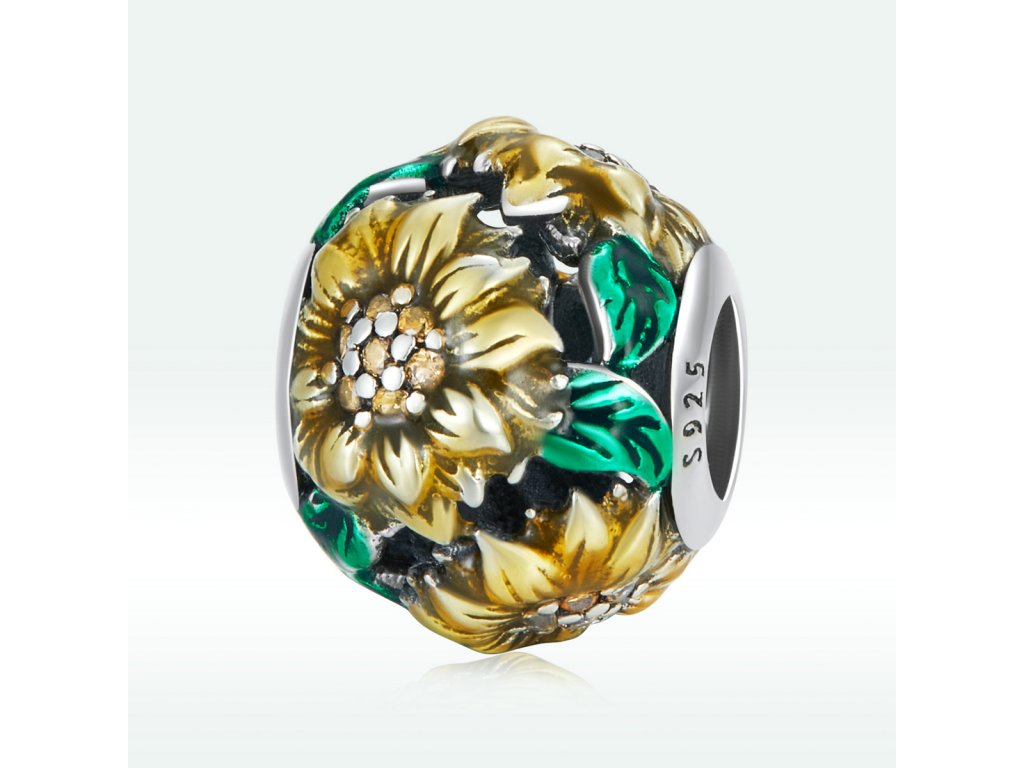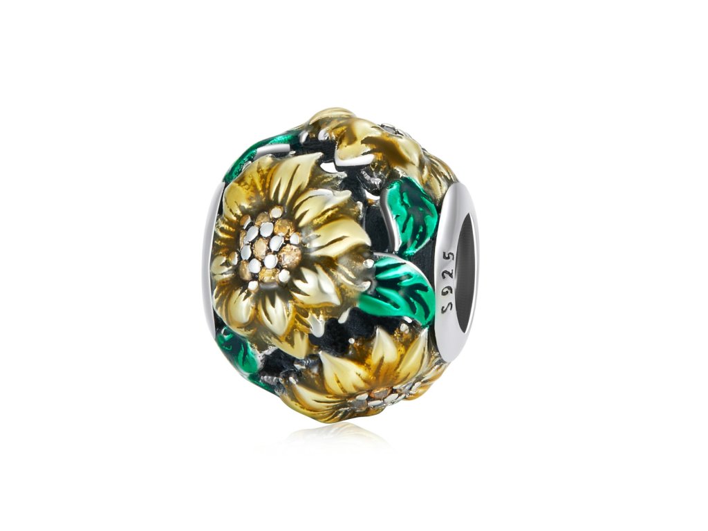 - Strieborný prívesok / korálek v dizajne poľa slnečníc zdobených zlatistými zirkónmi a ručne nanášanou farebnou glazúrou. Originálny design prívesku, kvalitné spracovanie a materiál, ručne dohotovené.
