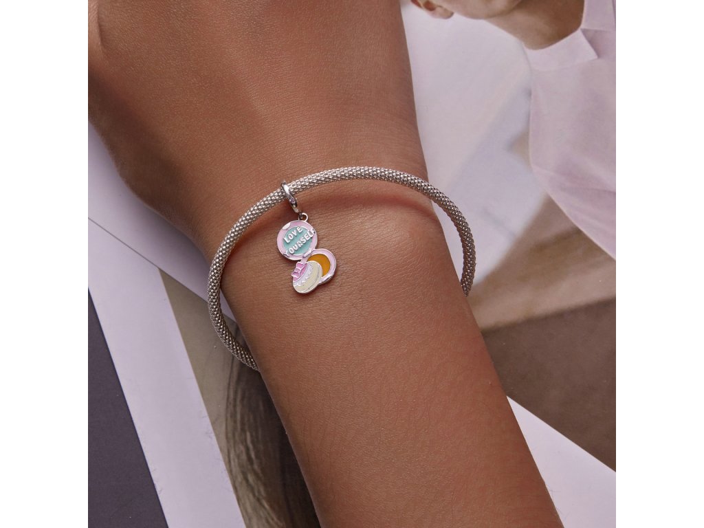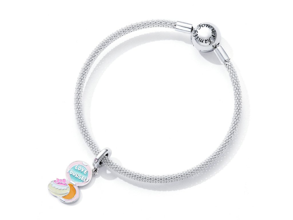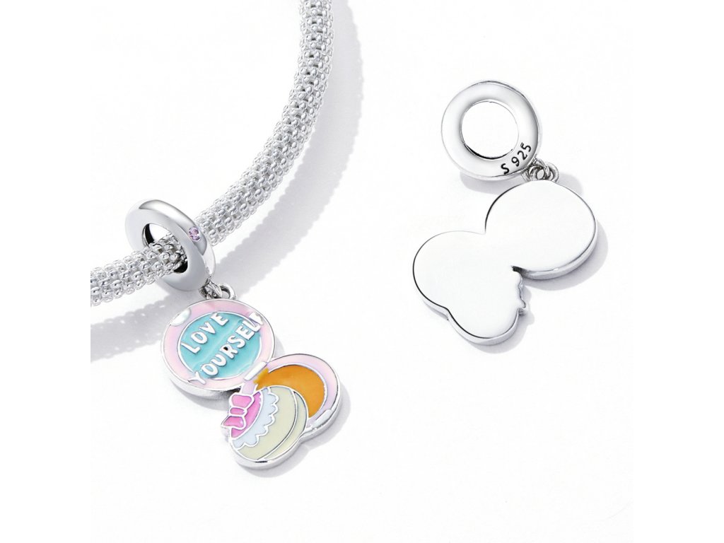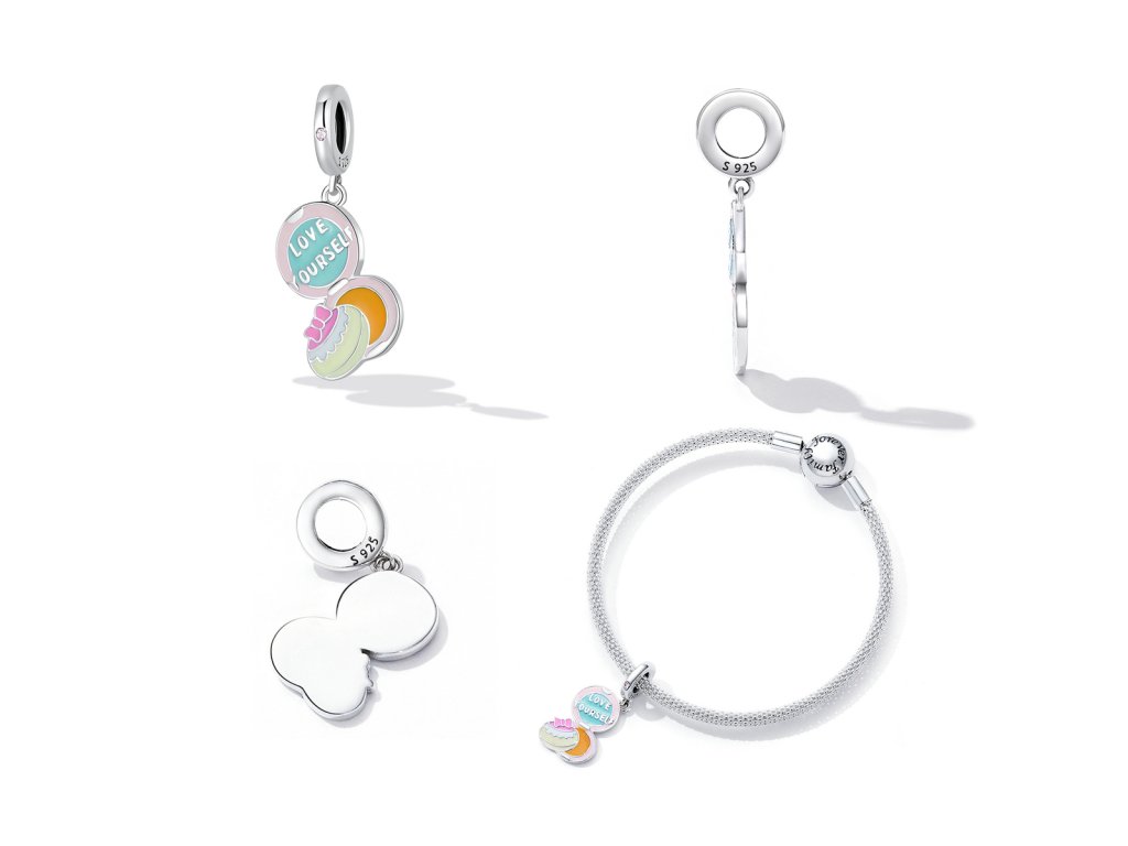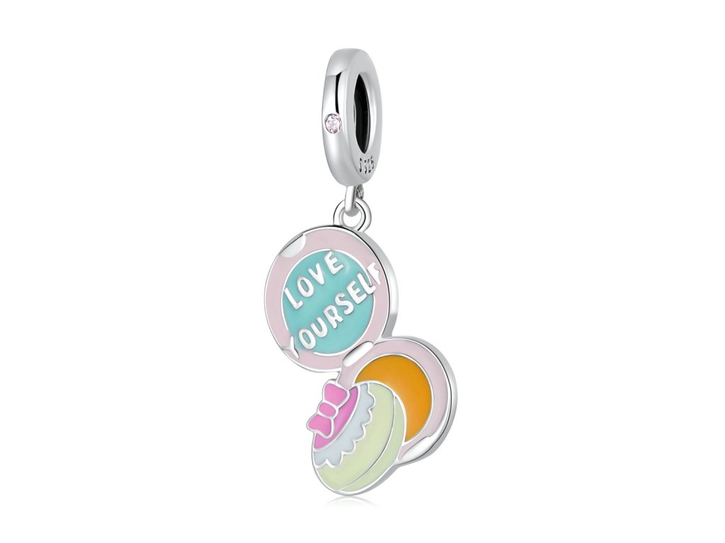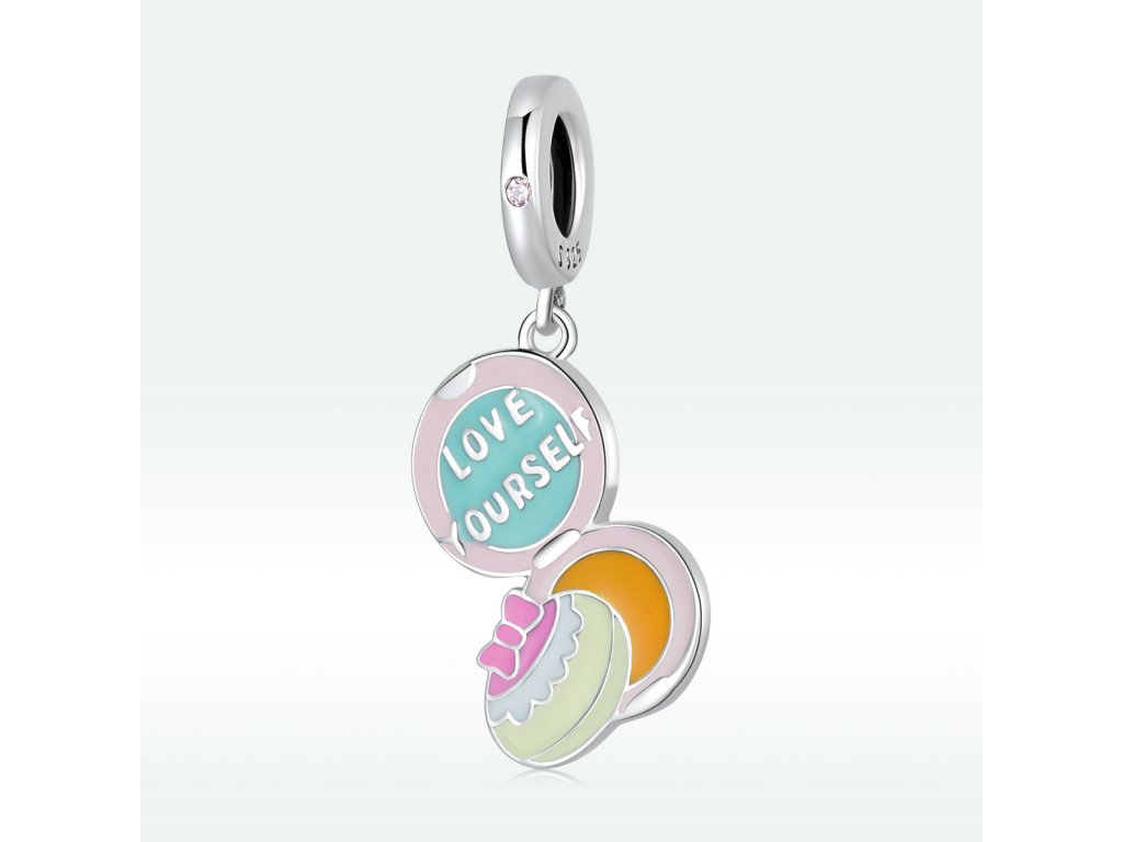 - Strieborný visiaci prívesok v dizajne princezniných líčidiel zdobených trblietavým ružovým zirkónom a ručne nanášanou farebnou glazúrou. Prívesok je obohatený anglickým nápisom "Love yourself" v preklade "Miluj samého seba". Originálny design prívesku, kvalitné spracovanie a materiál, ručne dohotovené.
