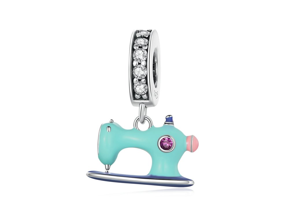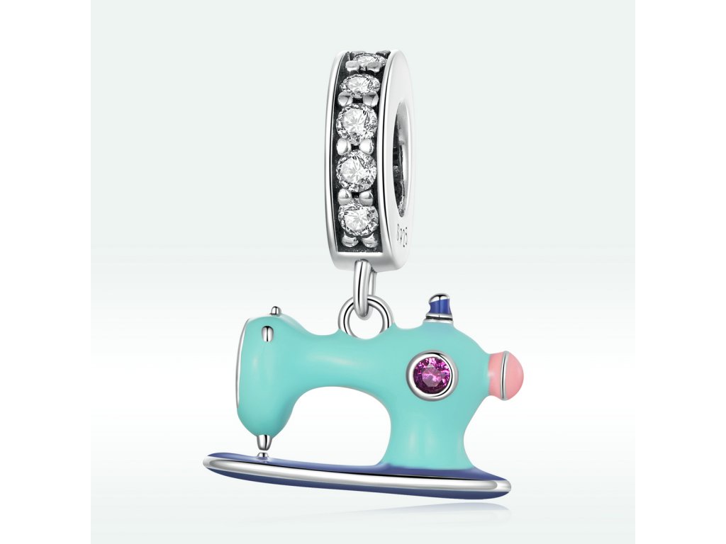 - Strieborný visiaci prívesok v dizajne milovaného šijacieho stroja zdobeného trblietavými zirkónmi a ručne nanášanou farebnou glazúrou. Originálny design prívesku, kvalitné spracovanie a materiál, ručne dohotovené.