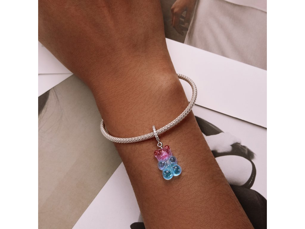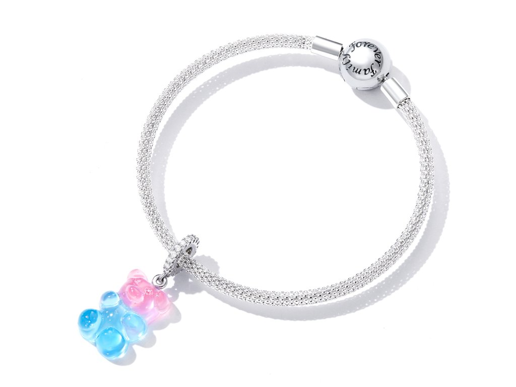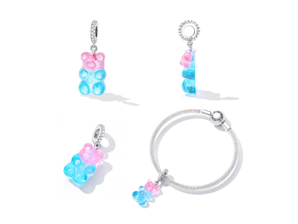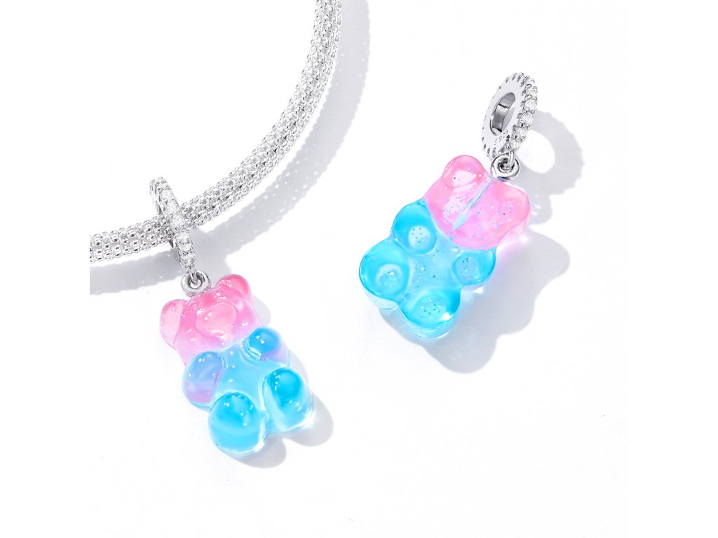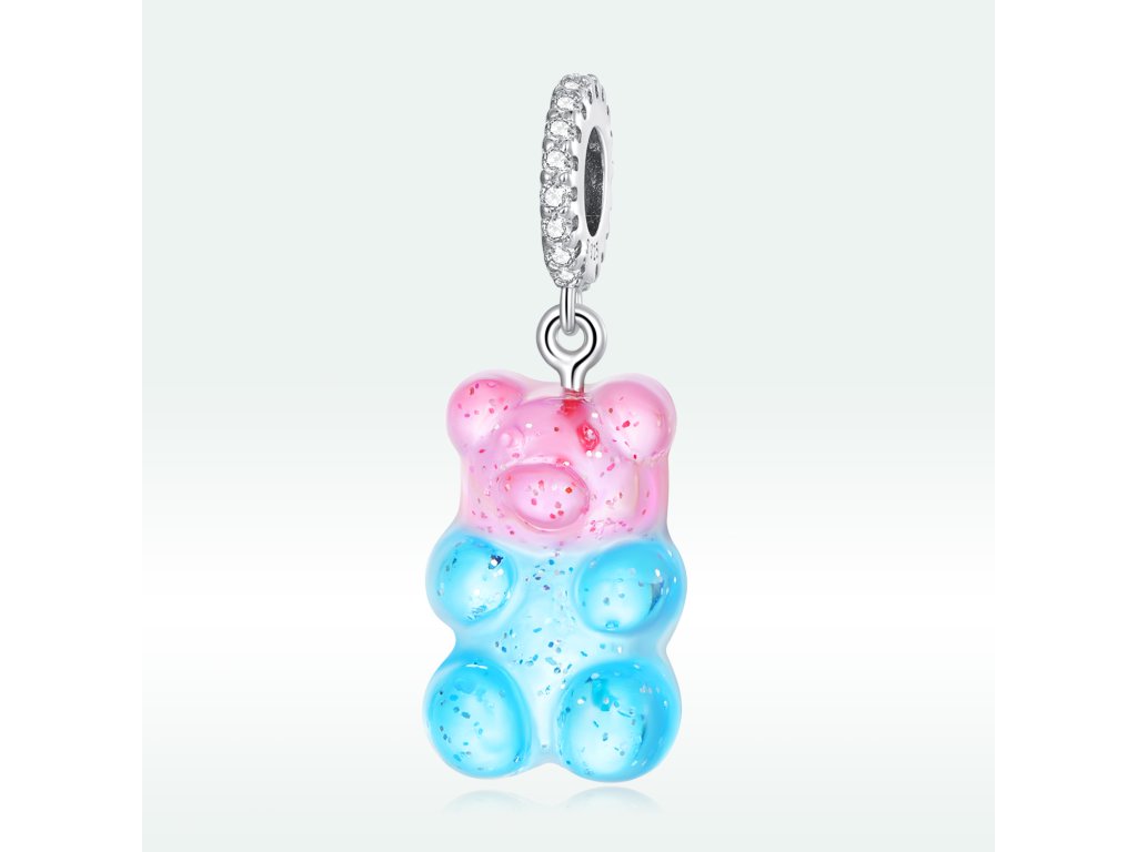 - Strieborný visiaci prívesok s čírymi zirkónmi v dizajne roztomilej sladkosti v podobe medvedíka zdobeného modro-ružovou živicou sa trblietkami. Originálny design prívesku, kvalitné spracovanie a materiál, ručne dohotovené.