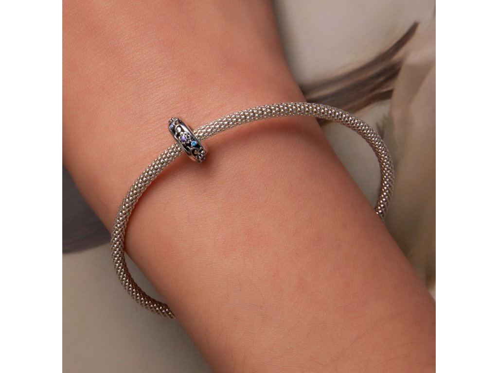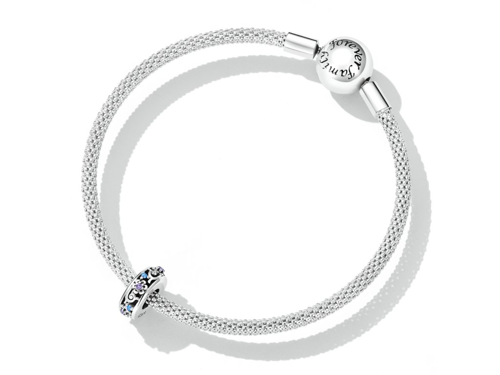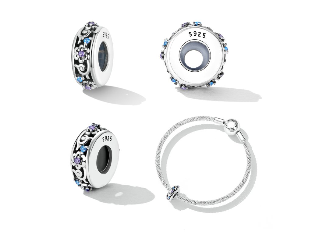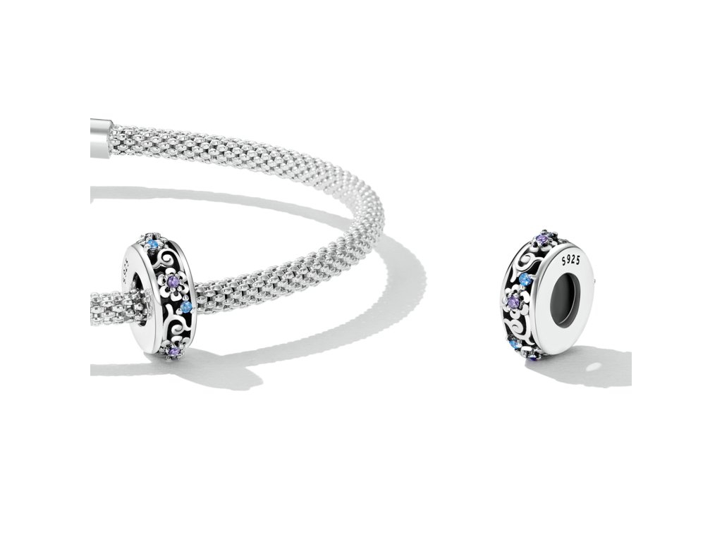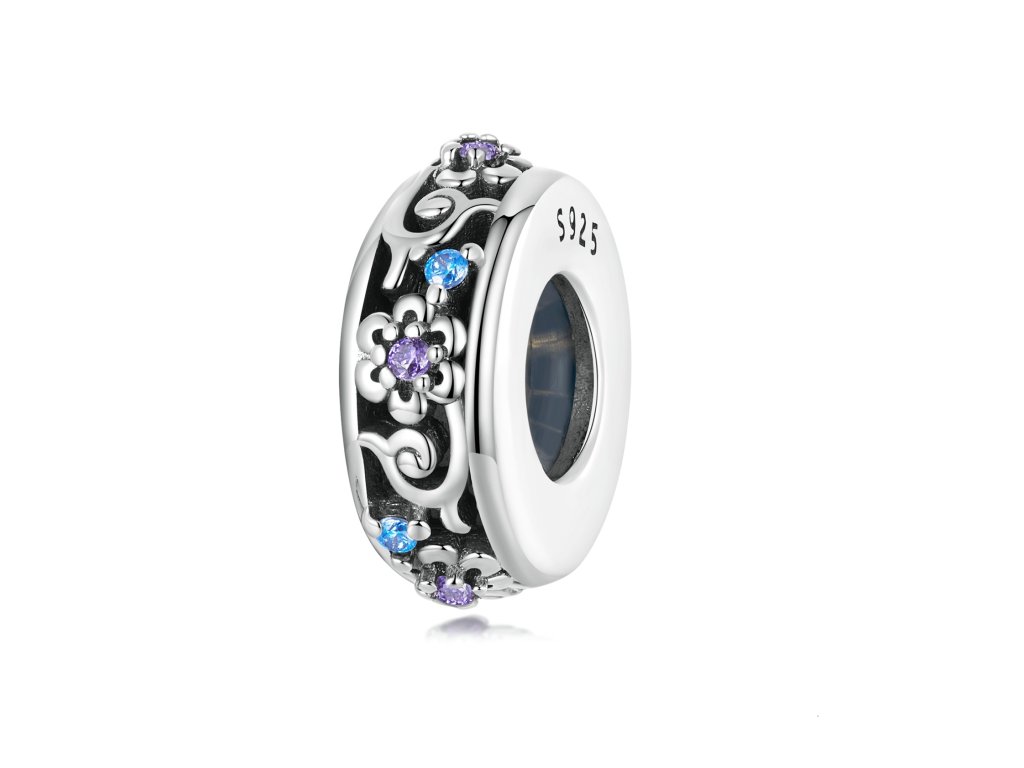 - Strieborný prívesok spacer zdobený kvetmi s fialovými a modrými trblietavými zirkónmi. Originálny design prívesku, kvalitné spracovanie a materiál, ručne dohotovené.