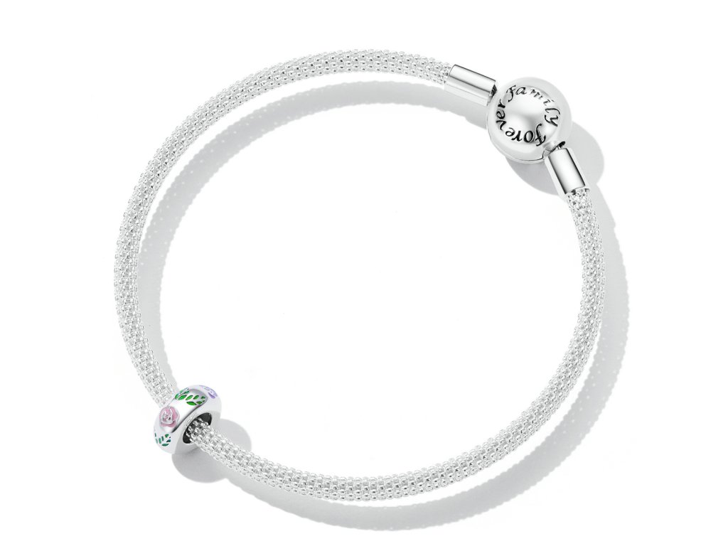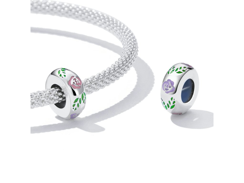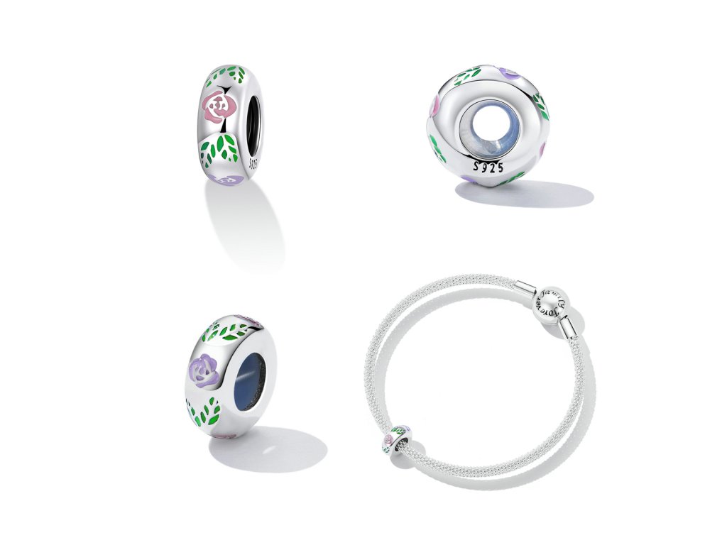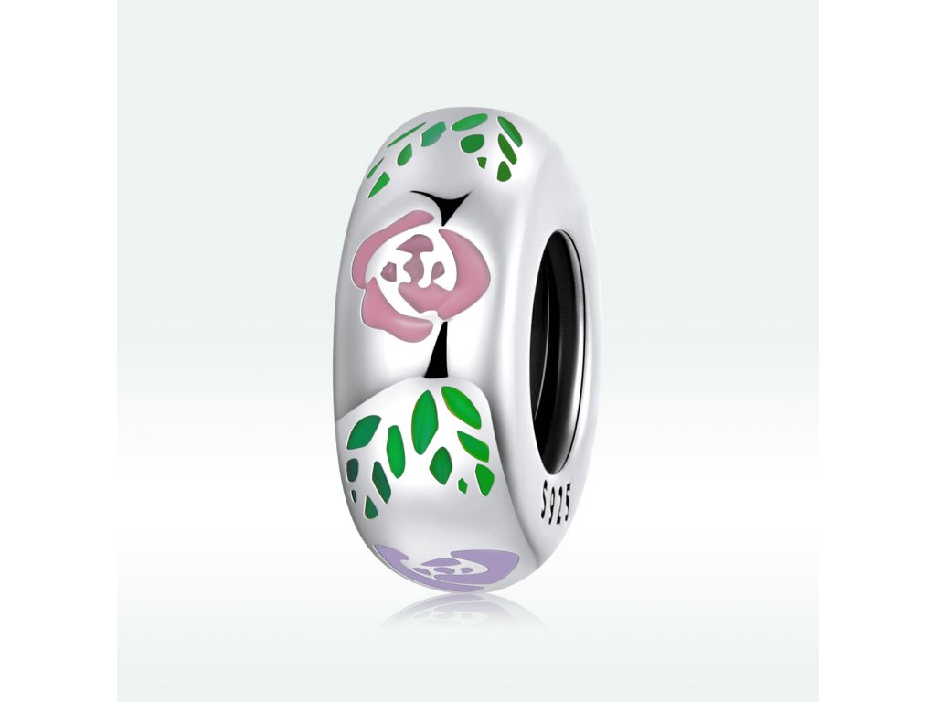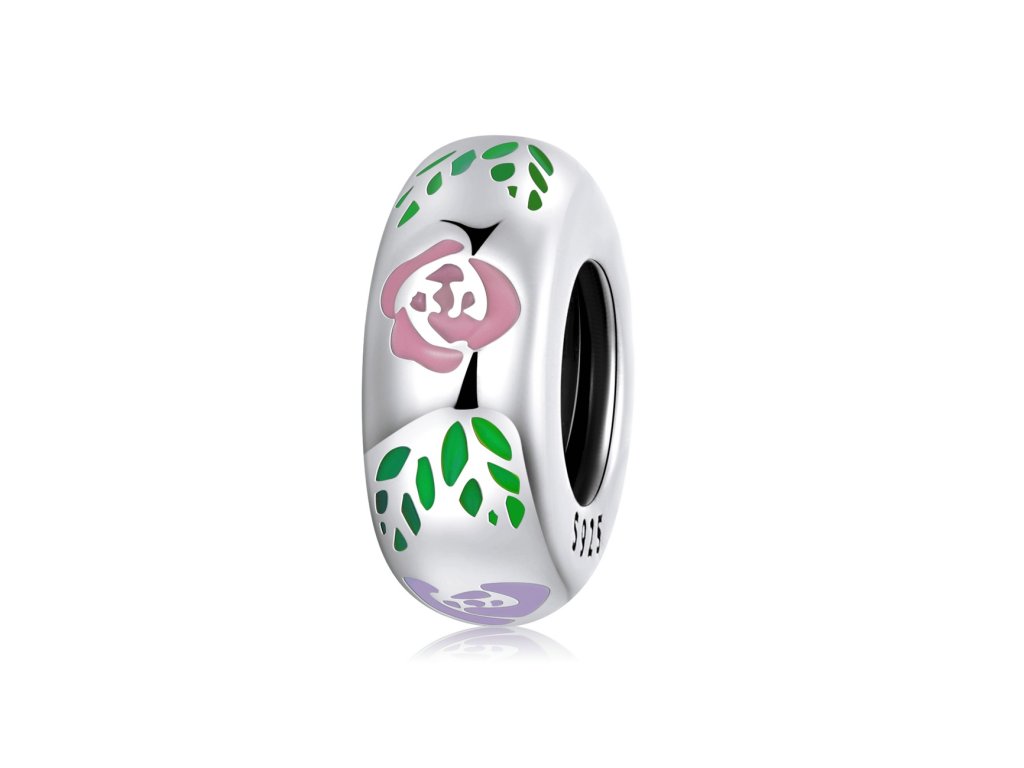 - Strieborný prívesok spacer v dizajne rozkvitnutých kvetov a lístkov zdobených ručne nanášanou farebnou glazúrou. Originálny design prívesku, kvalitné spracovanie a materiál, ručne dohotovené.