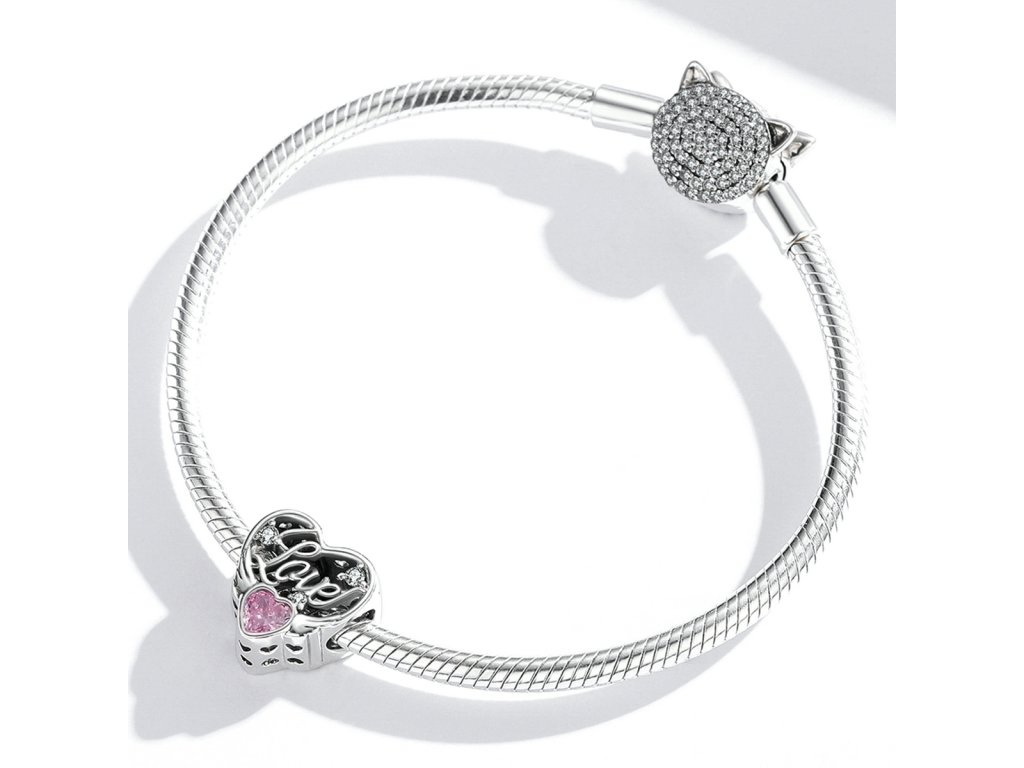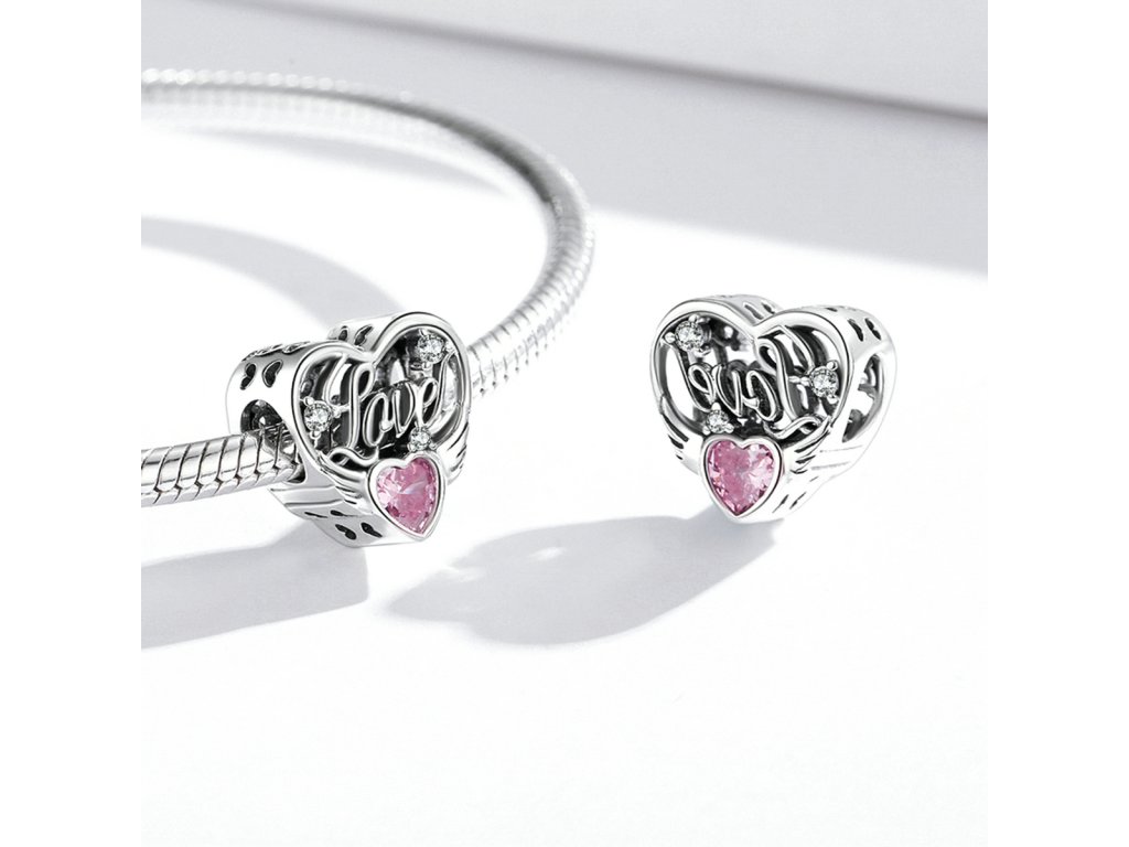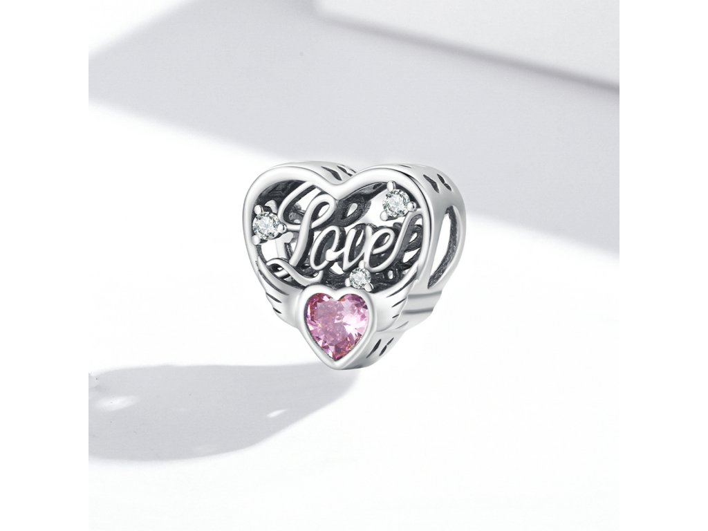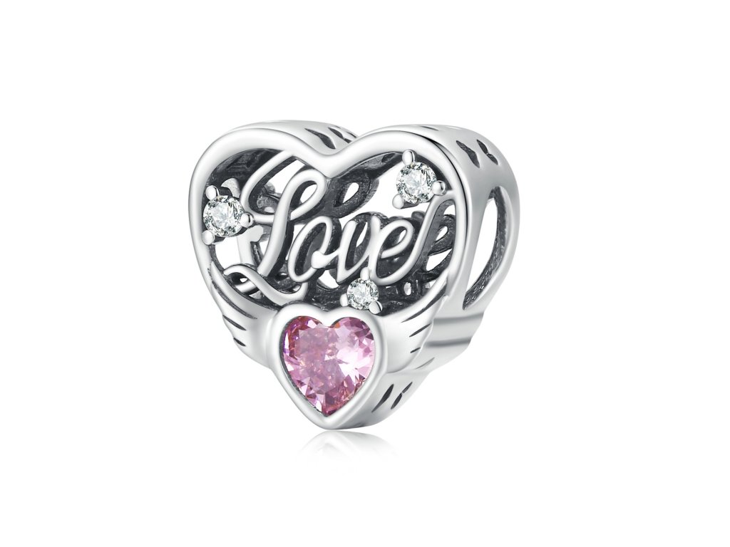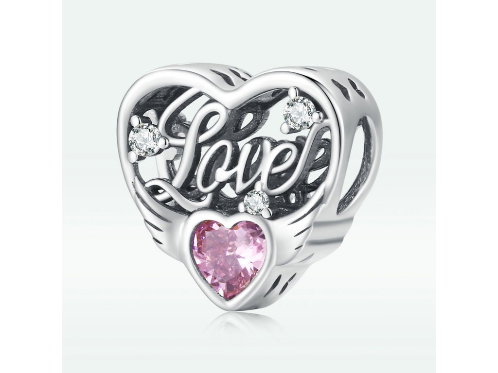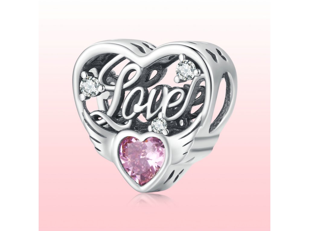 - Strieborný prívesok v tvare milovaného srdca zdobeného anglickým nápisom "Love" v preklade "Láska". Prívesok je tiež obohatený čírymi trblietavými zirkónmi a ružovými brúsenými zirkónmi v tvare srdca s krídlami. Strany prívesku zdobia ručne vyrezávané srdiečka. Originálny design prívesku, kvalitné spracovanie a materiál, ručne dohotovené.