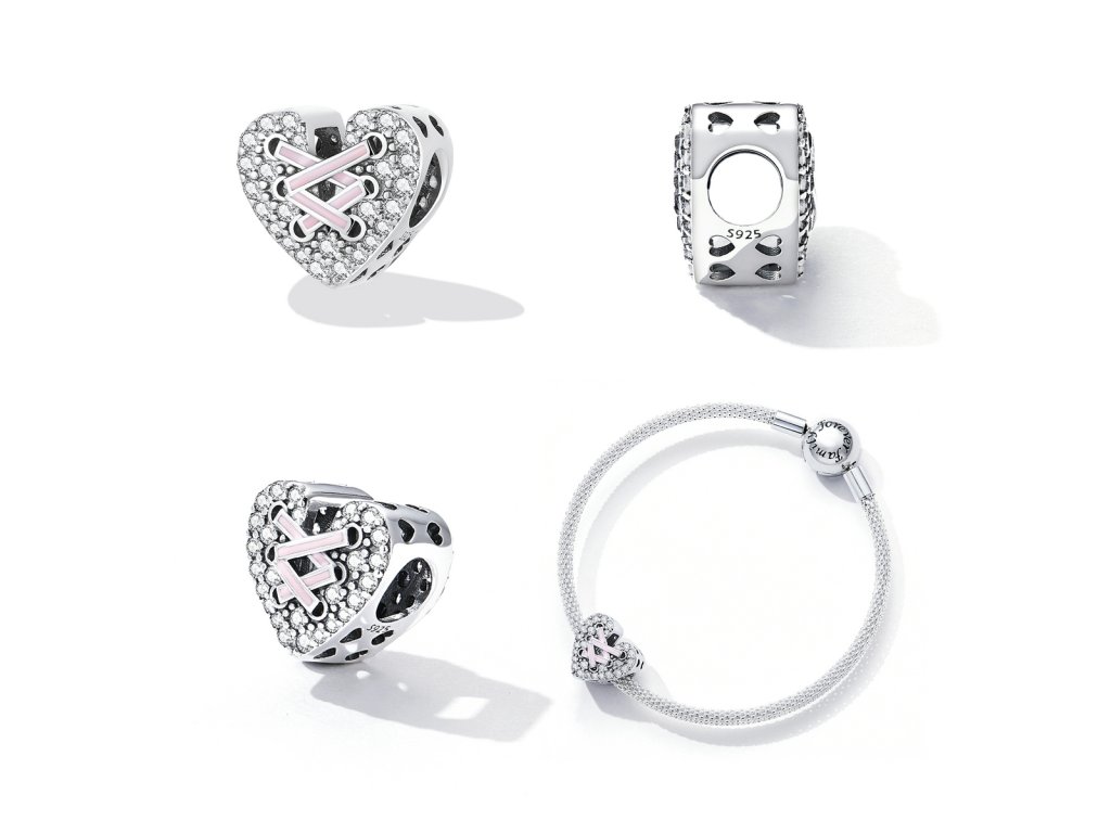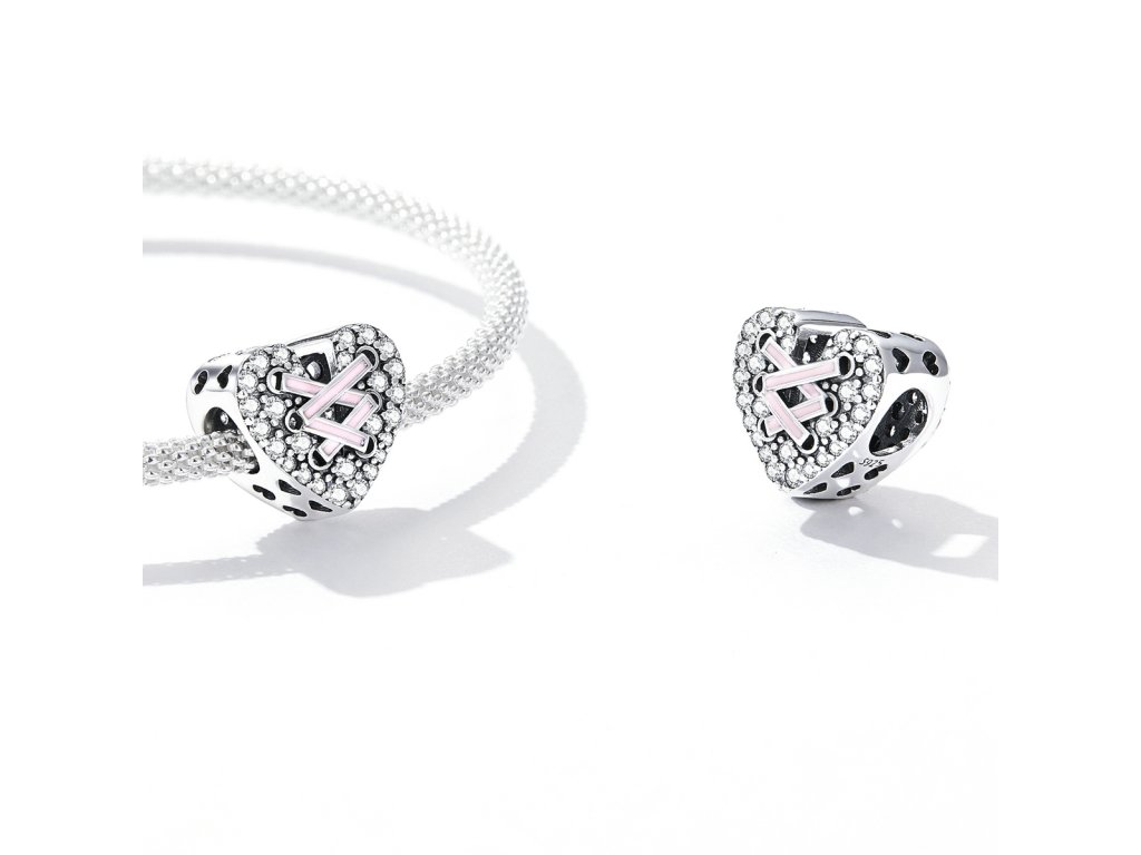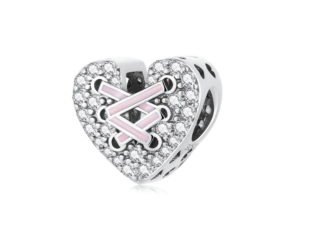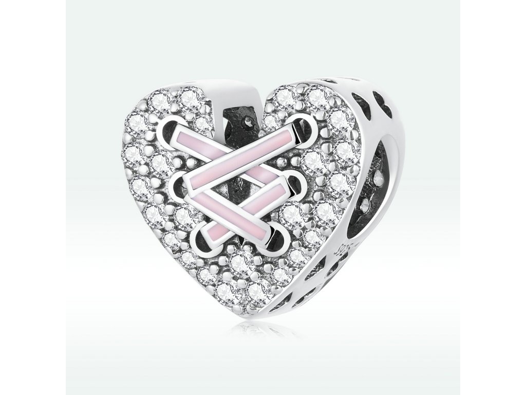 - Strieborný prívesok v tvare srdca so stuhou zdobený čírymi trblietavými zirkónmi a ručne nanášanou ružovou glazúrou. Prívesok je tiež zdobený ručne vyrezávanými milovanými srdiečkami po stranách. Originálny design prívesku, kvalitné spracovanie a materiál, ručne dohotovené.