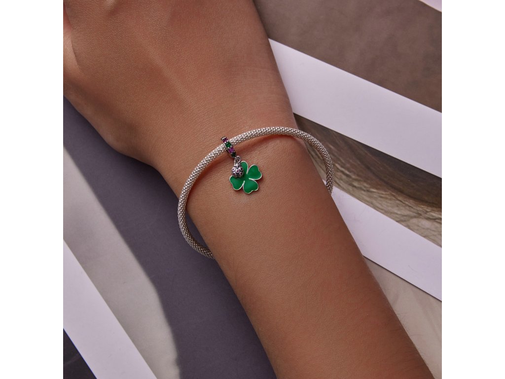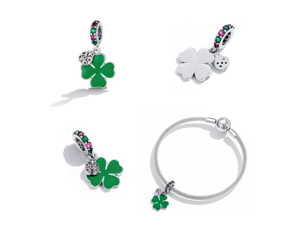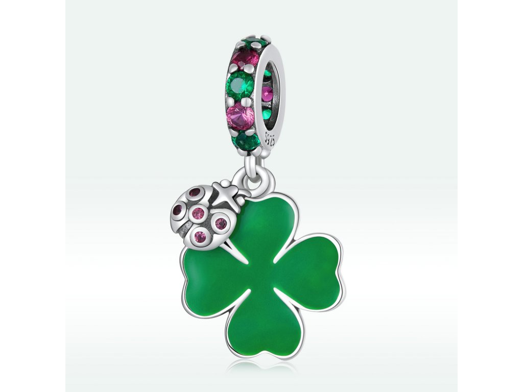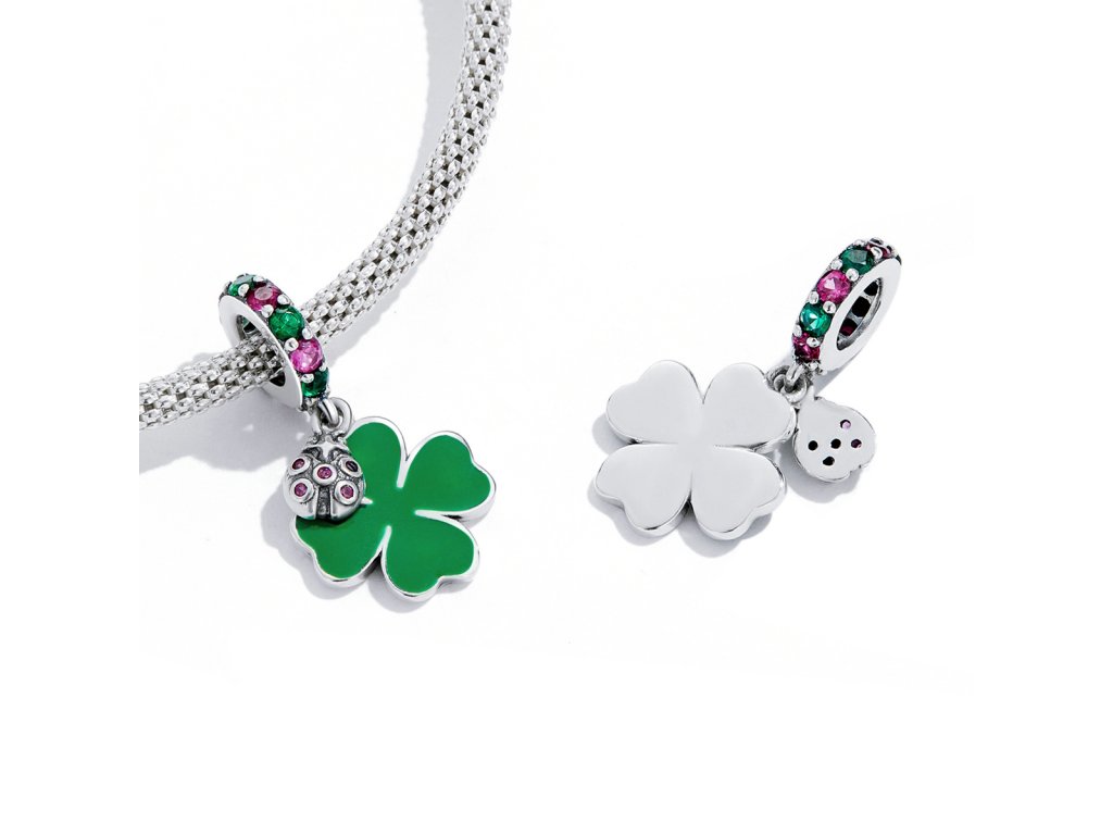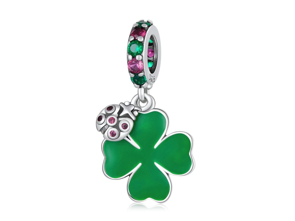 - Strieborný visiaci prívesok v dizajne štvorlístka pre šťastie s krásnou lienkou. Prívesok je zdobený ručne nanášanou zelenou glazúrou a trblietavými farebnými zirkónmi. Originálny design prívesku, kvalitné spracovanie a materiál, ručne dohotovené.