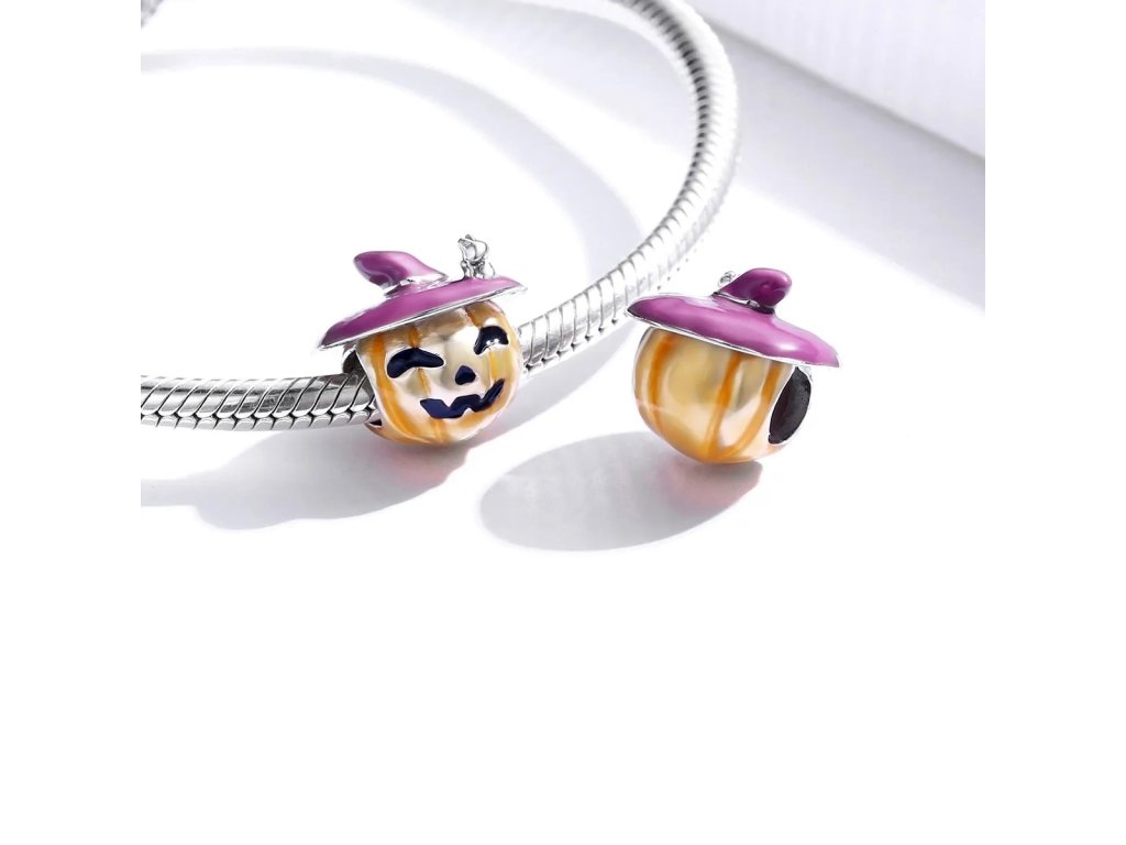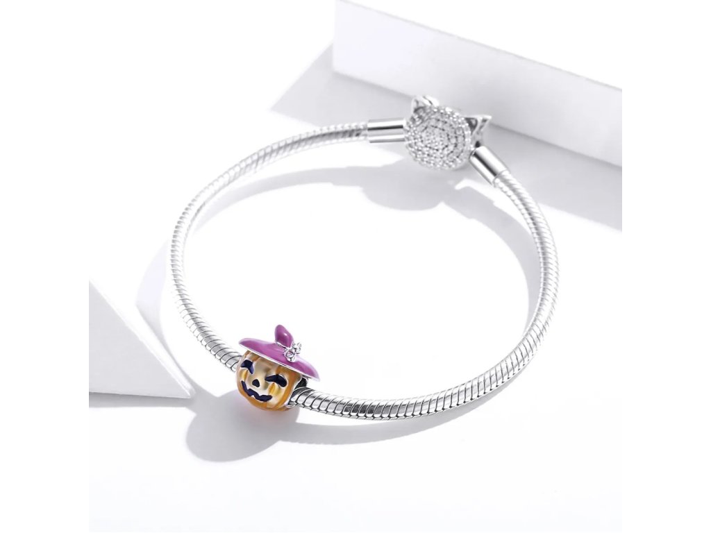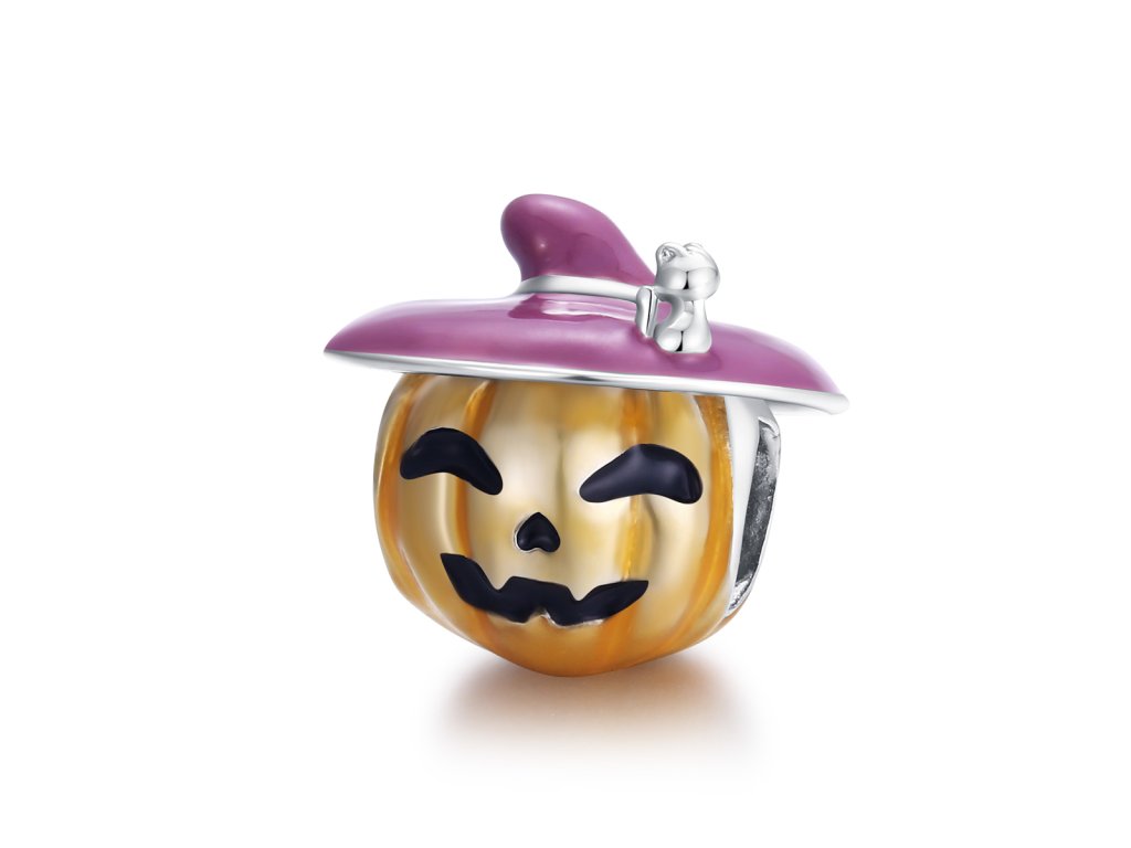 - Strieborný prívesok z kolekcie Halloween. Prívesok v dizajne tekvice s klobúkom je detailne zdobený ručne nanášanou farebnou glazúrou.