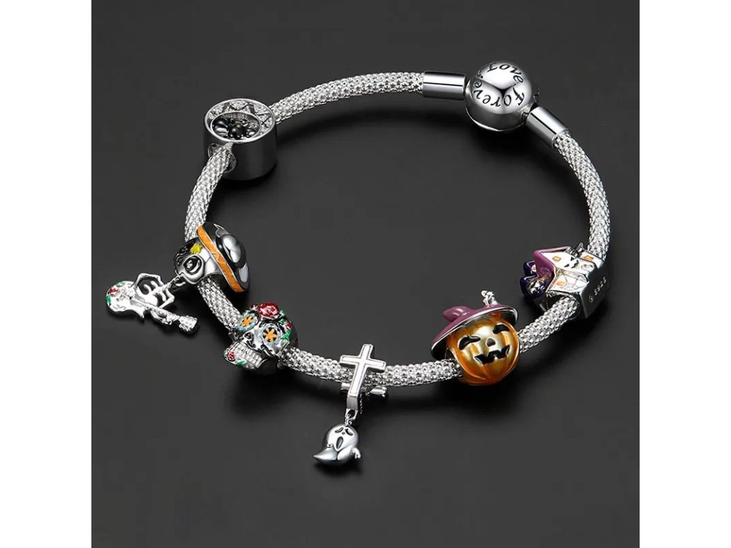 - Strieborný prívesok z kolekcie Halloween. Prívesok v dizajne strašidelnej tekvice zdobená glazúrou svietiacou v tme.
