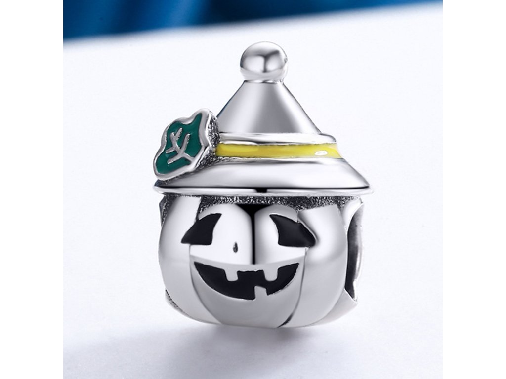 - Strieborný prívesok z kolekcie Halloween. Prívesok v dizajne tekvice s klobúkom je ručne nanášaný farebnou glazúrou.