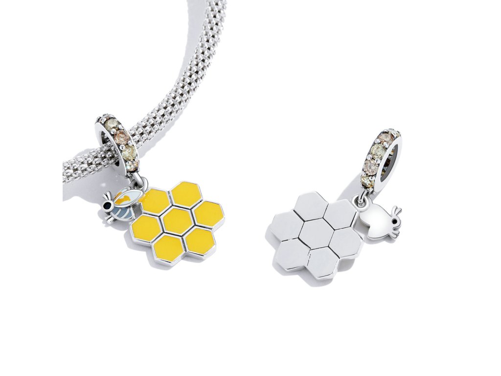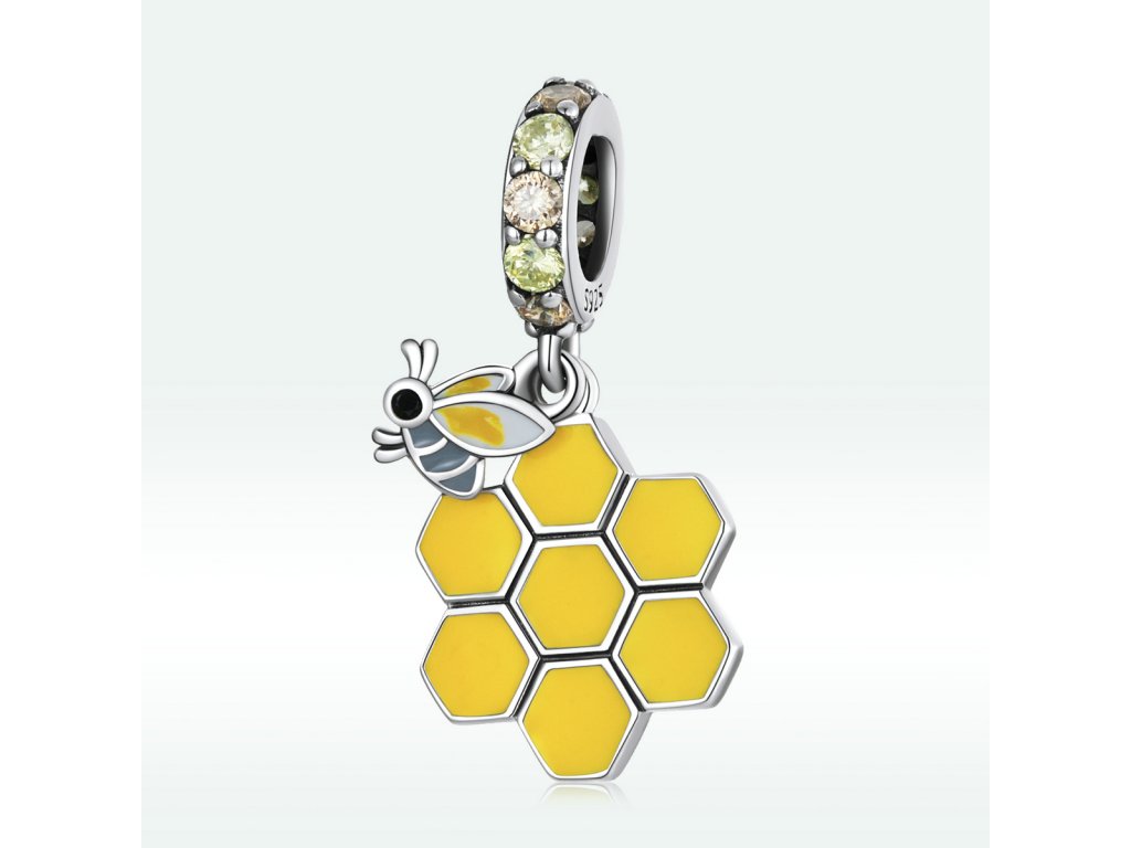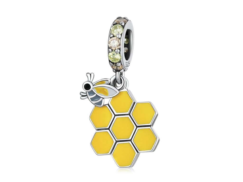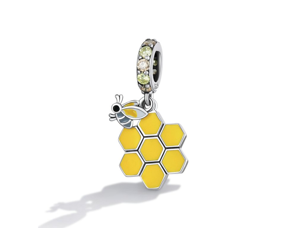 - Strieborný visiaci prívesok v dizajne včelieho úľa a roztomilé včielky zdobený ručne nanášanou farebnou glazúrou. Prívesok je tiež obohatený trblietavými žltými a zlatistými zirkónmi. Originálny design prívesku, kvalitné spracovanie a materiál, ručne dohotovené.