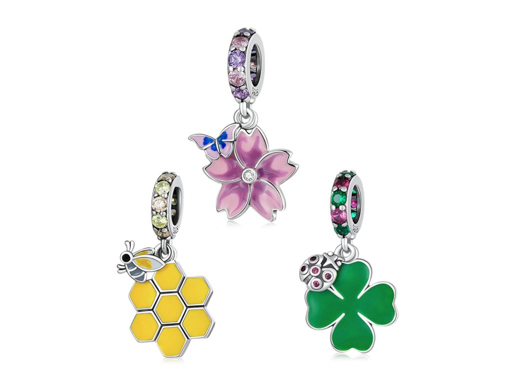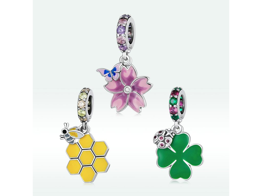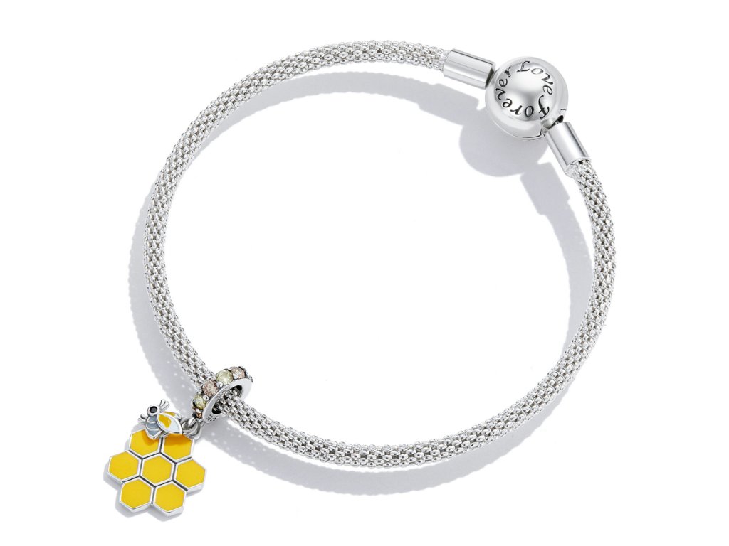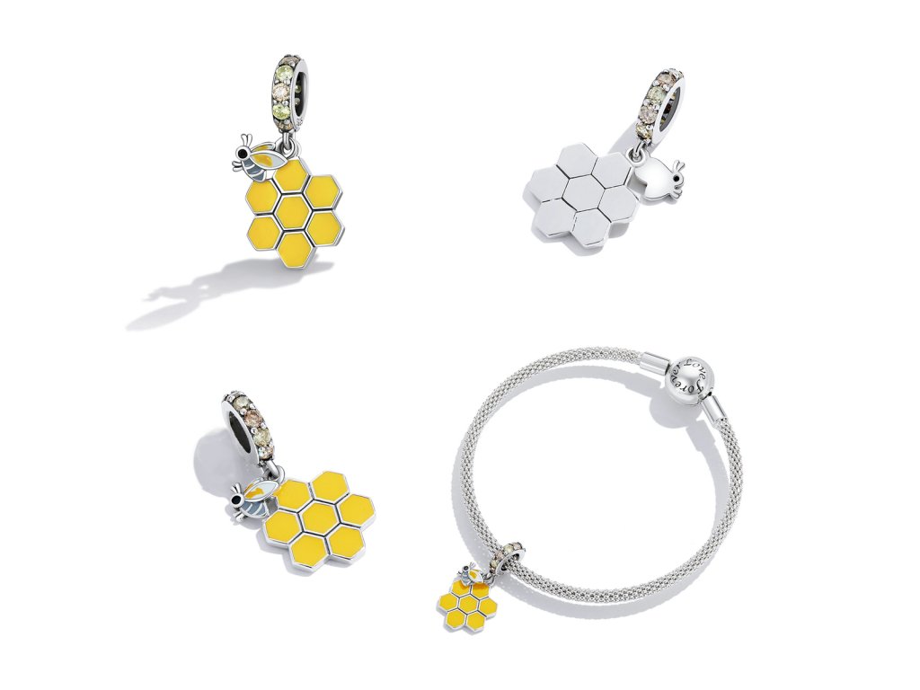 - Strieborný visiaci prívesok v dizajne včelieho úľa a roztomilé včielky zdobený ručne nanášanou farebnou glazúrou. Prívesok je tiež obohatený trblietavými žltými a zlatistými zirkónmi. Originálny design prívesku, kvalitné spracovanie a materiál, ručne dohotovené.