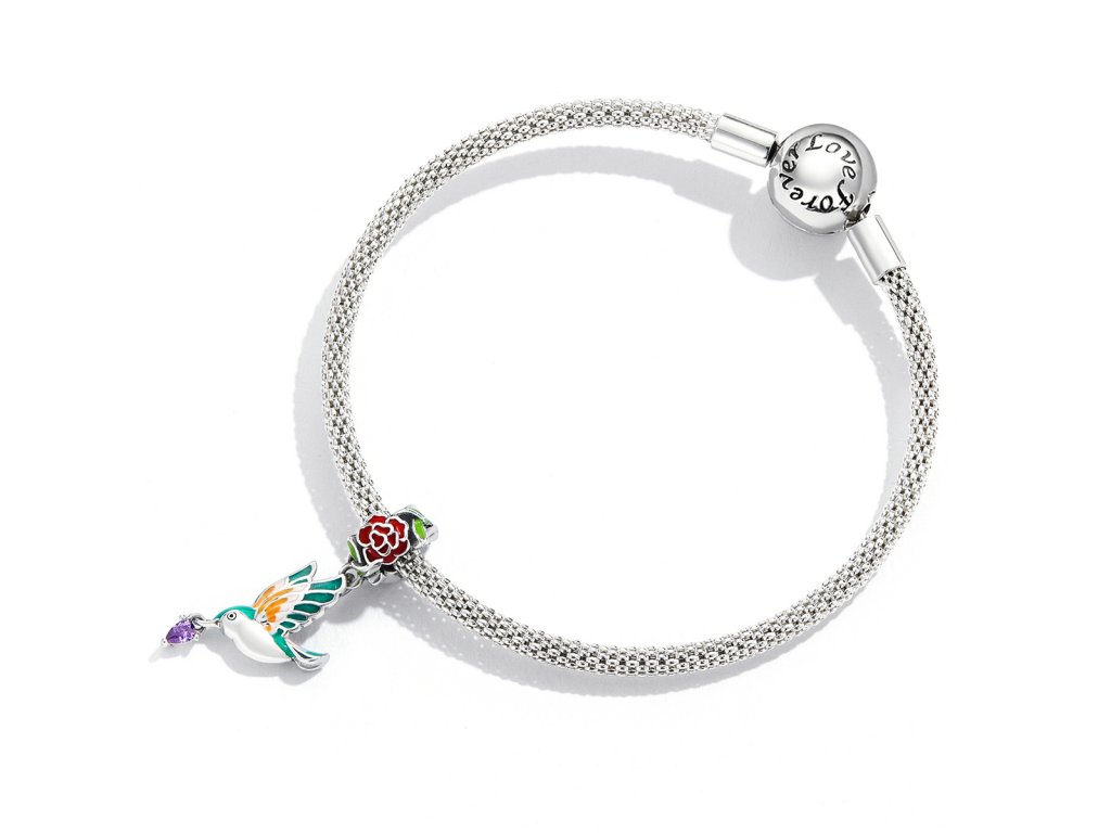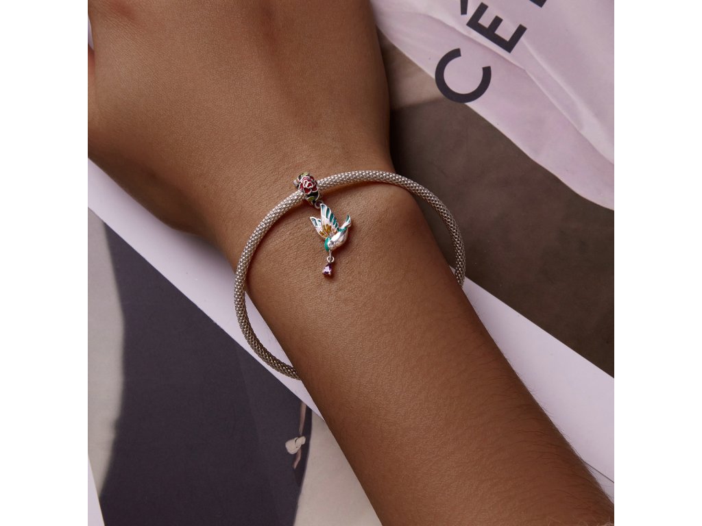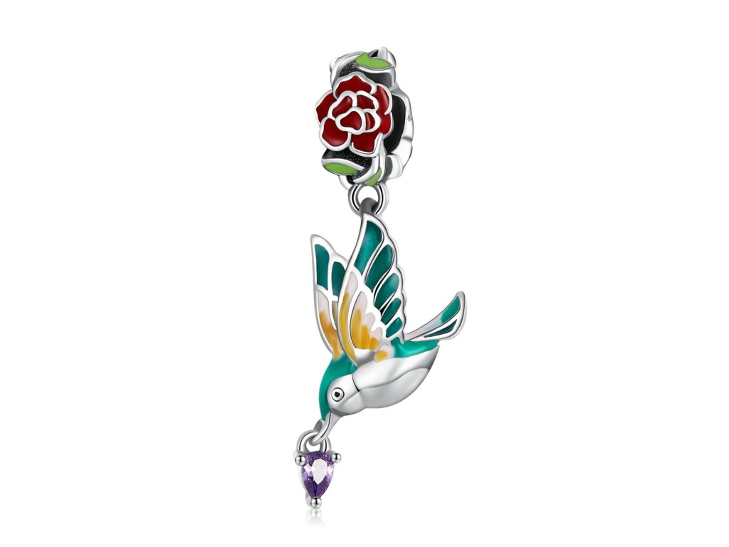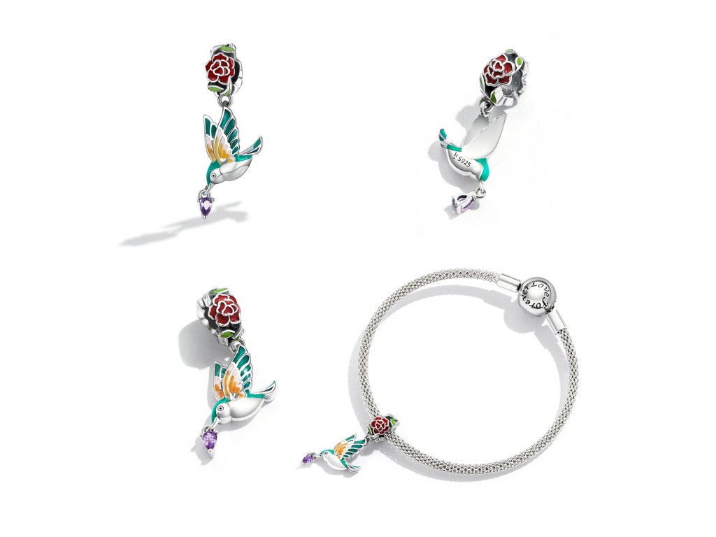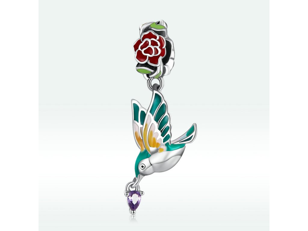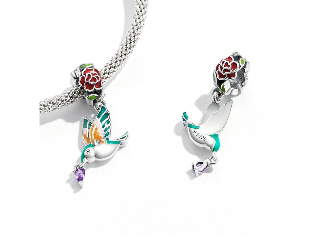 - Strieborný visiaci prívesok v dizajne milovaného vtáčika s kvetmi zdobený fialovým zirkónom a ručne nanášanou farebnou glazúrou. Originálny design prívesku, kvalitné spracovanie a materiál, ručne dohotovené.