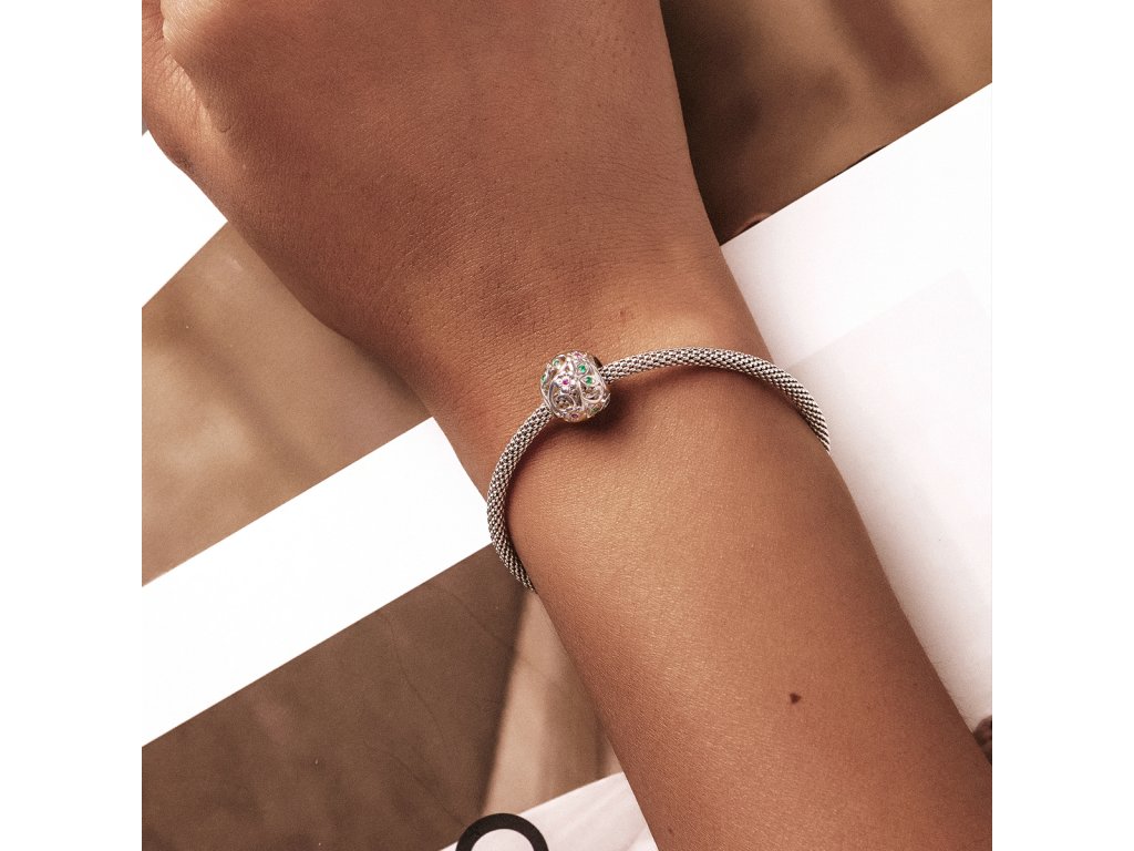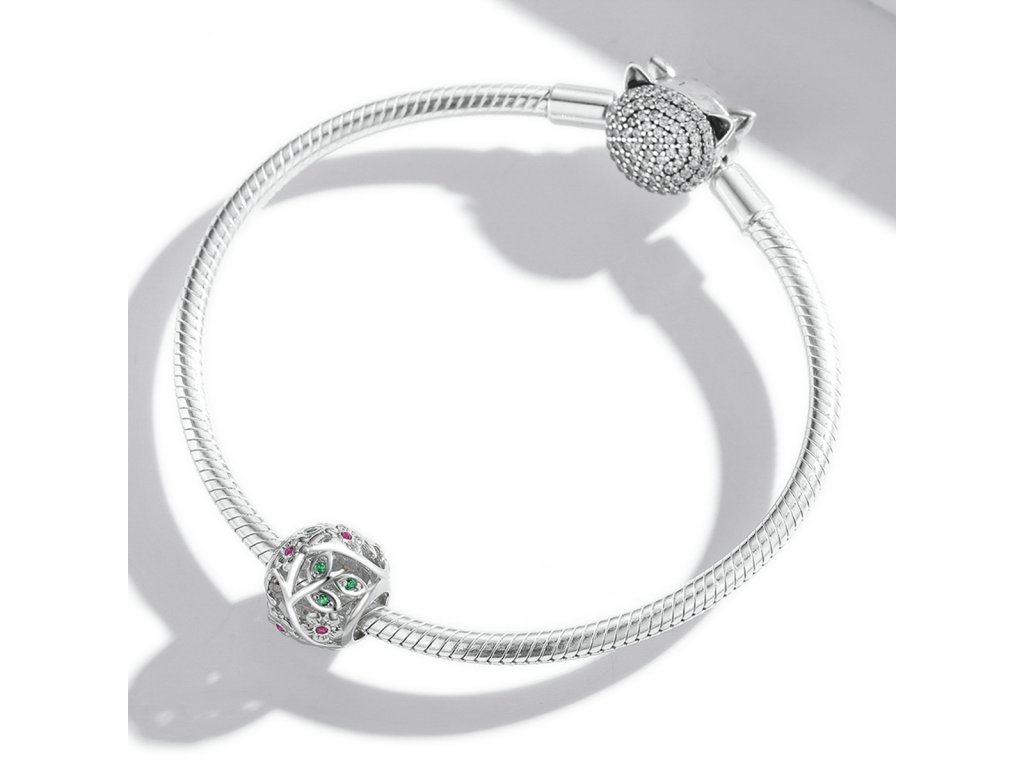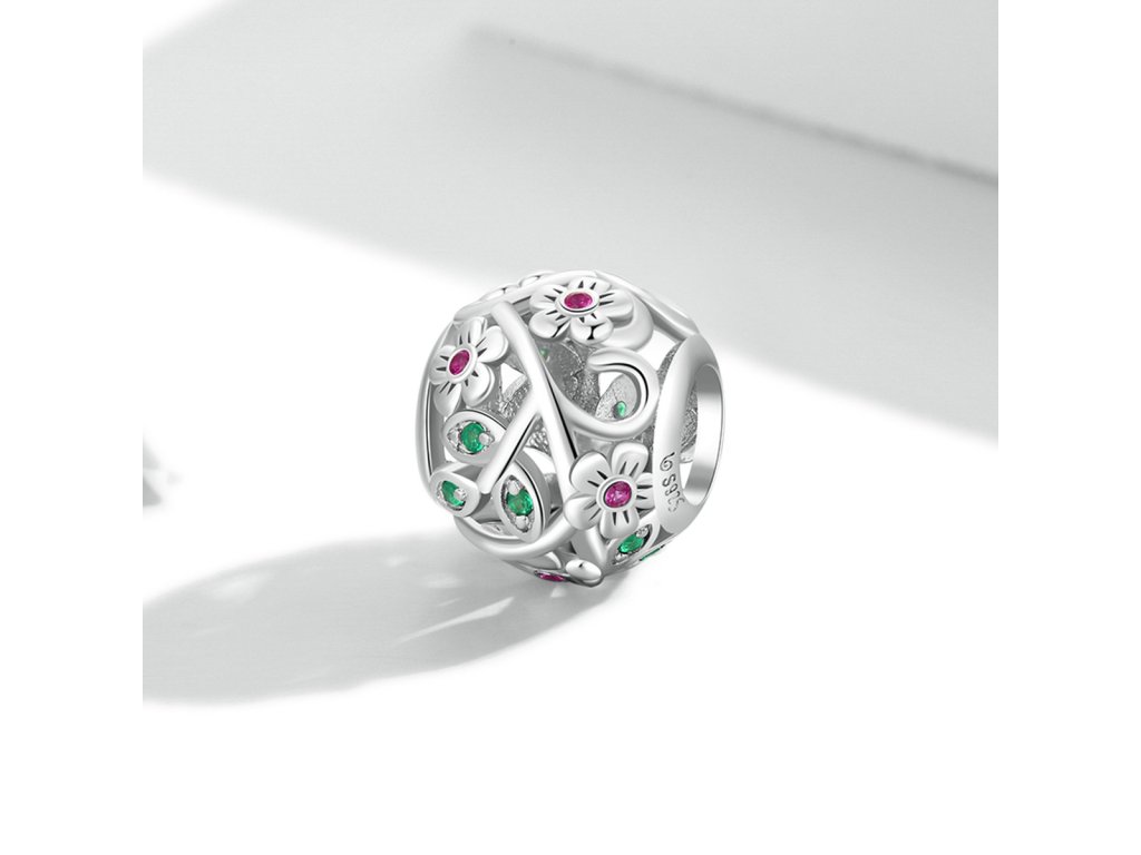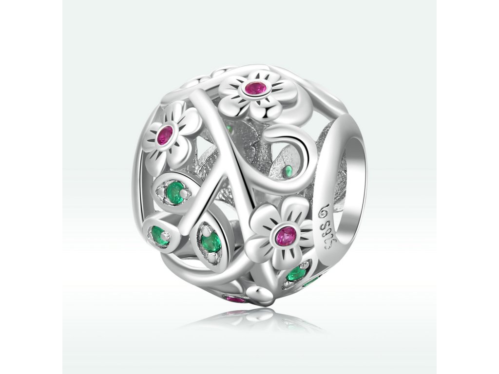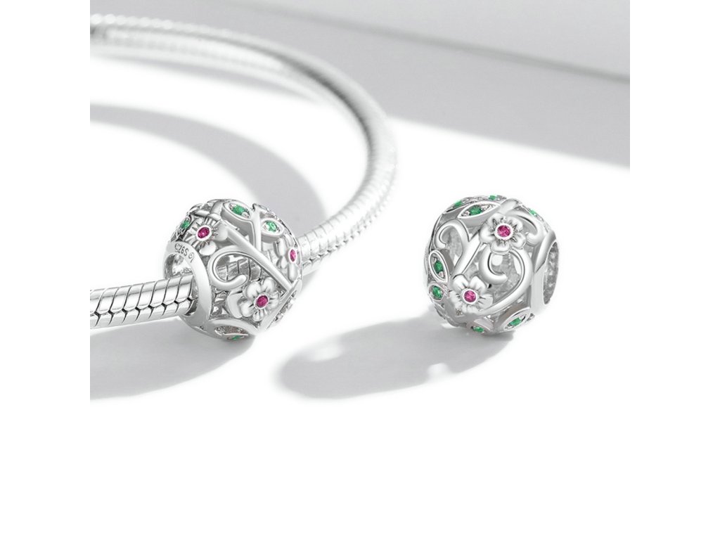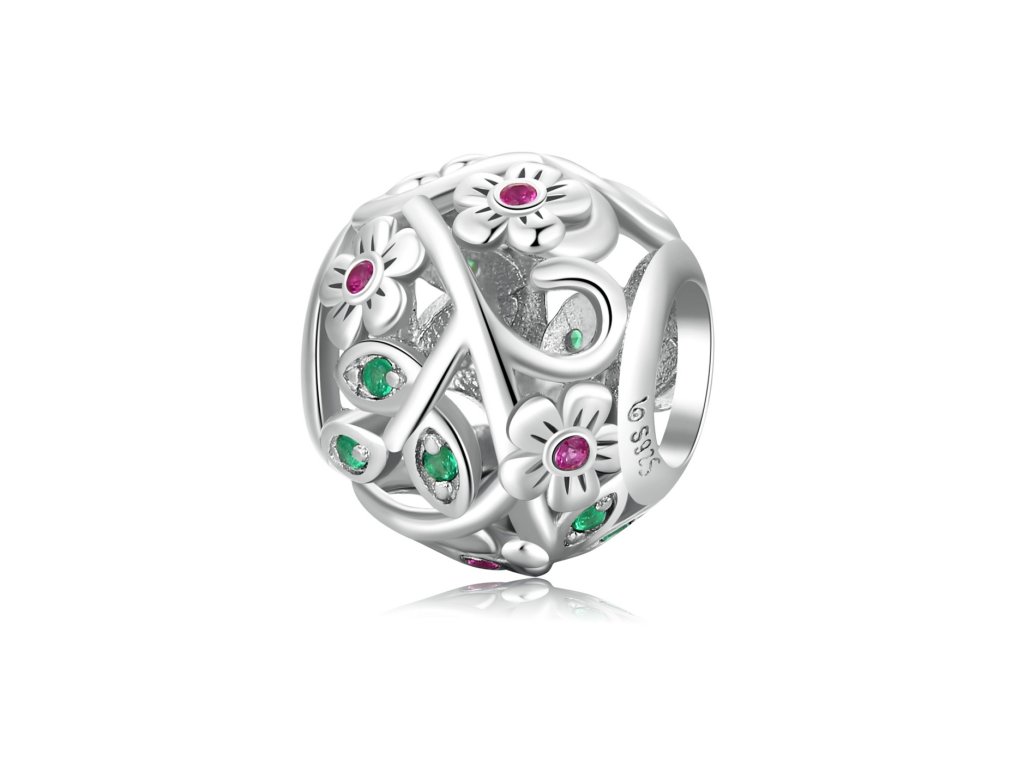 - Strieborný prívesok / korálek v dizajne kvetín a lístkov zdobených čerešňovo červenými a zelenými zirkónmi. Originálny design prívesku, kvalitné spracovanie a materiál, ručne dohotovené.