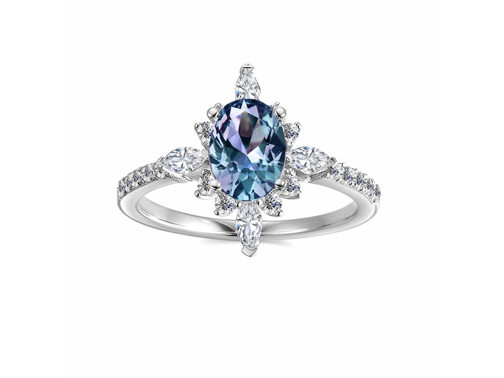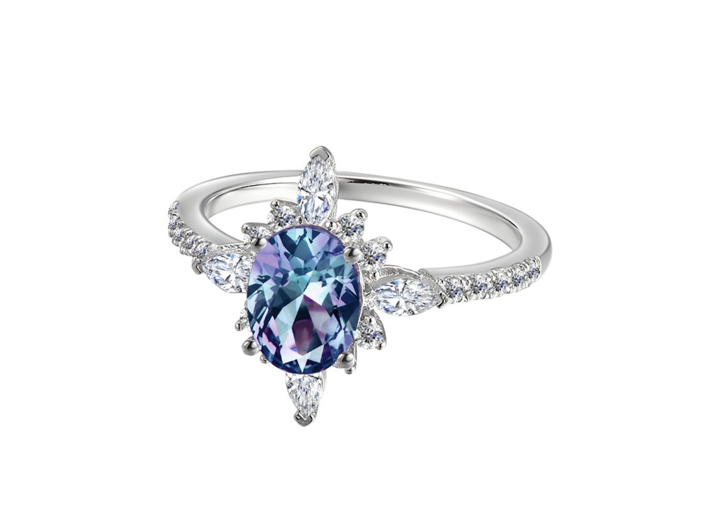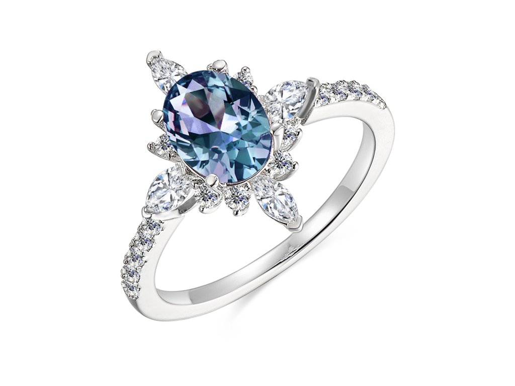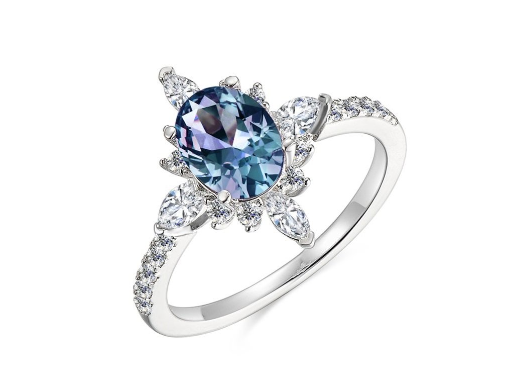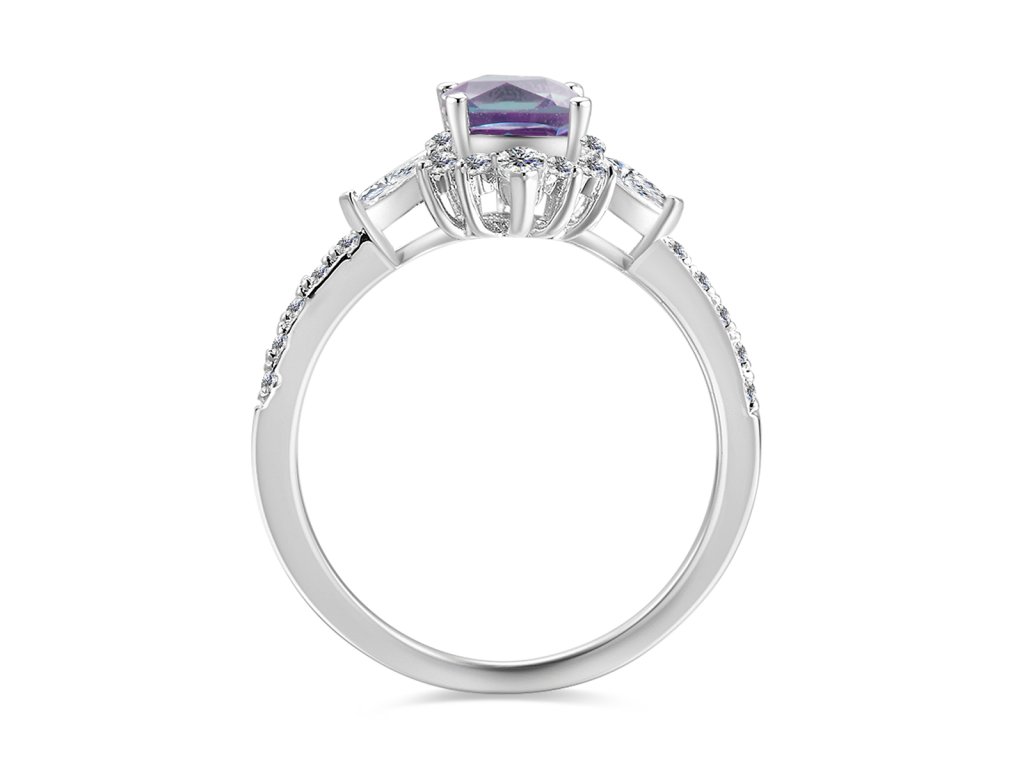 • Hypoalergenie strieborný prsteň pozlátený 18 karátovým bielym zlatom zdobený Alexandritom a zirkónmi. Originálny dizajn prsteňa, kvalitné spracovanie a materiál, ručne dohotovené.