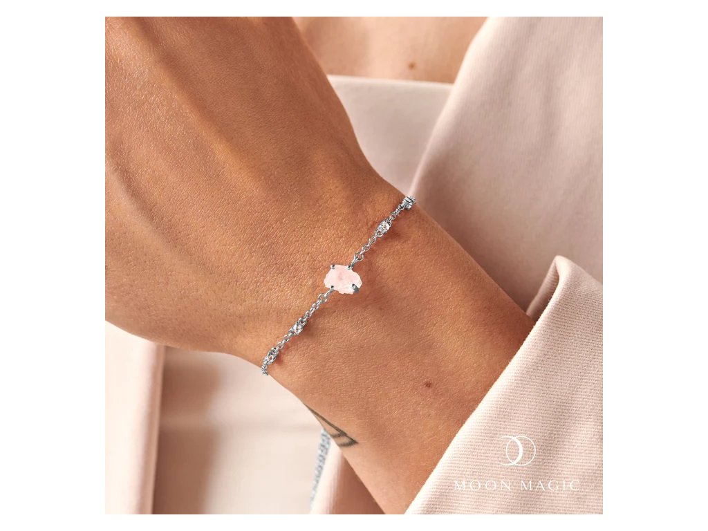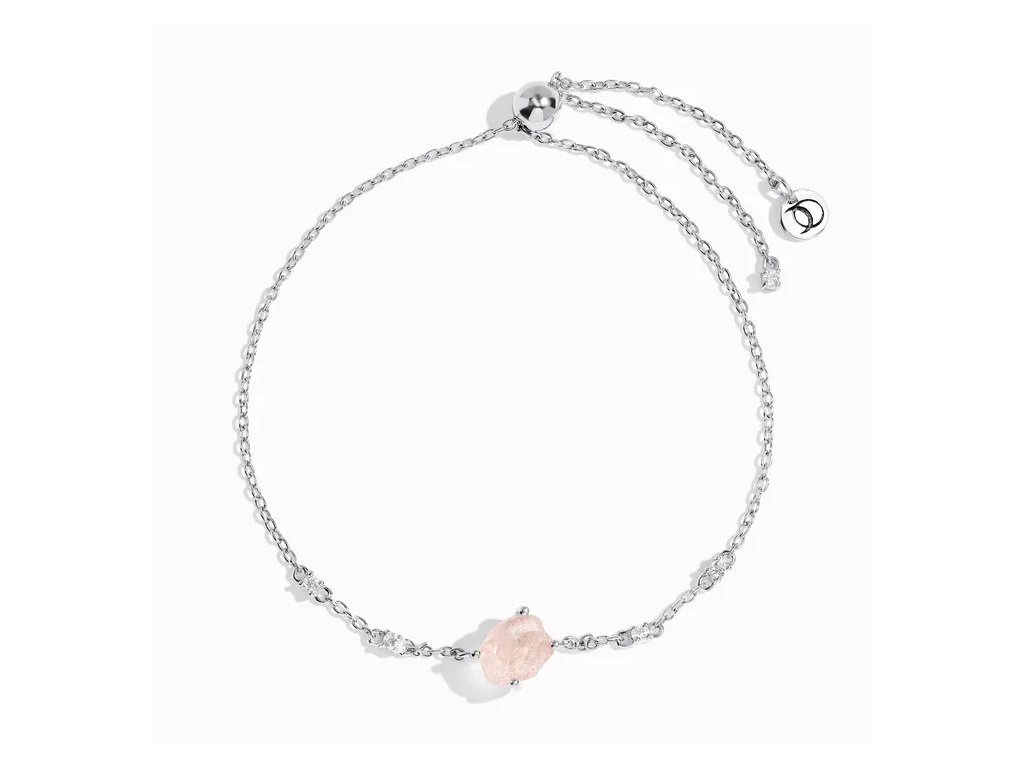Neopracovaný Raw náramok kombinuje ručne zbieraný autentický ruženín s trblietavými drahokamami bieleho topazu. Tento nastaviteľný náramok, krásne vyvážený na elegantnej retiazke, predstavuje silný krok k sebeláske.