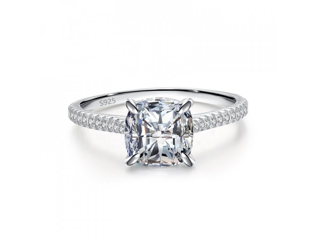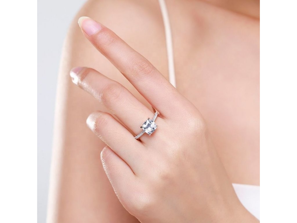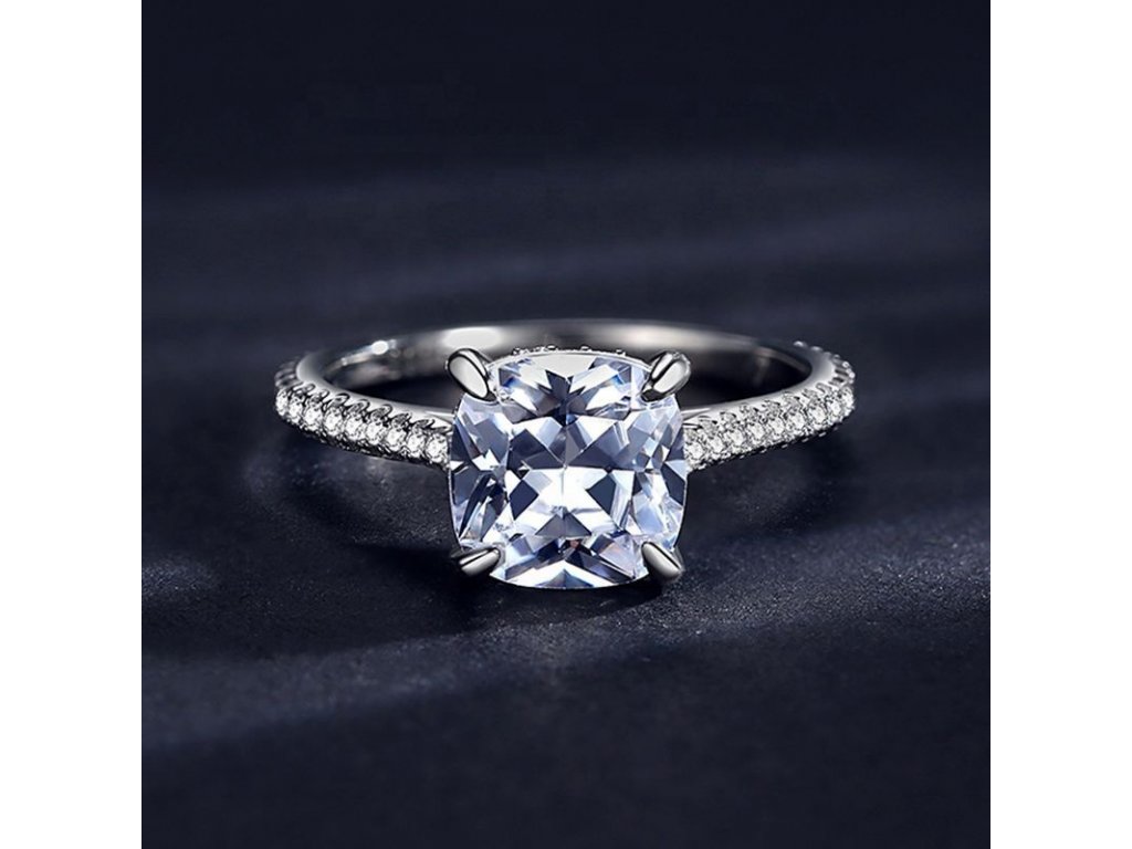 - Strieborný rhodiovaný prsteň v štýlovom dizajne posiaty čírymi trblietavými zirkónmi po svojom obvode. Stred prsteňa tvorí číry brúsený zirkóniový kameň v tvare štvorca. Originálny dizajn prsteňa, kvalitné spracovanie a materiál, ručne dohotovené.