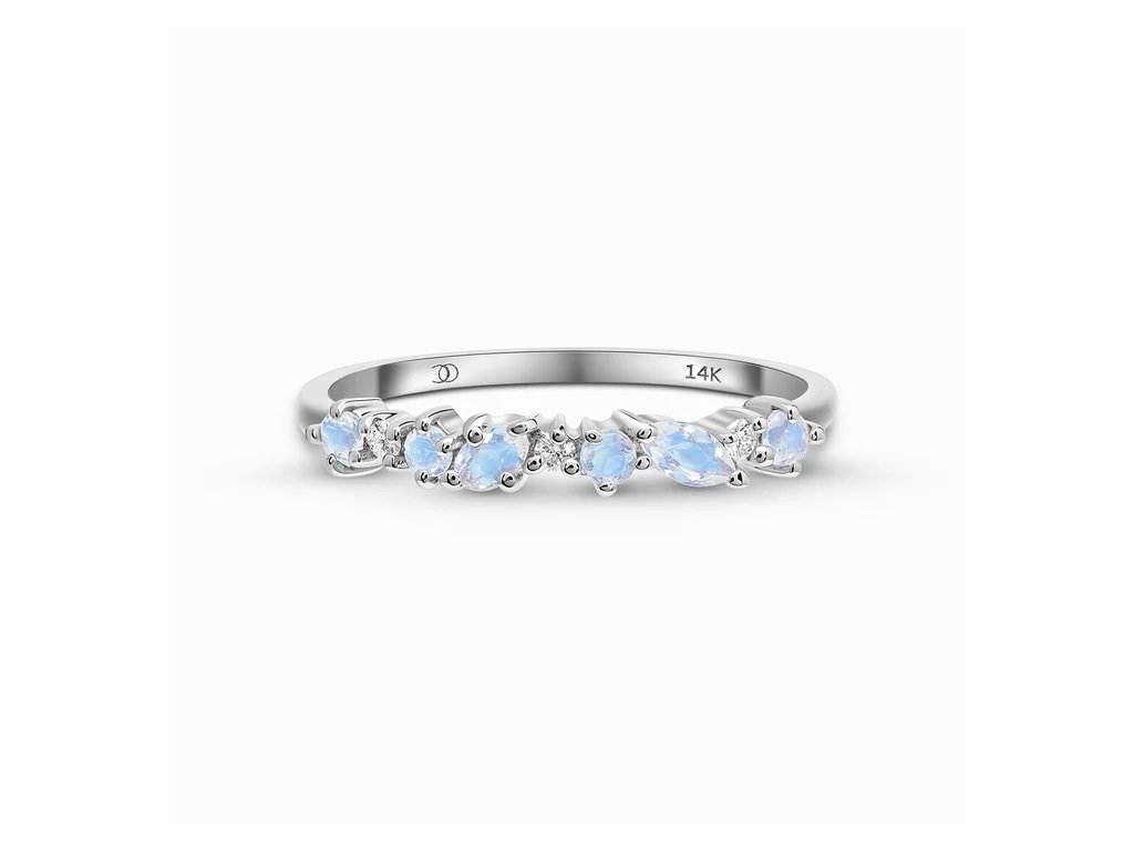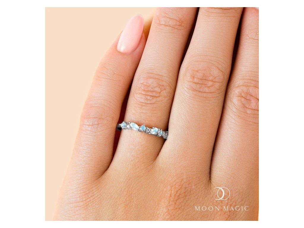 Jemný, ale pôvabný prsteň s množstvom tvarov rozhodne nie je šperkárska klasika. Pomocou striedajúcich sa trblietavých prírodných mesačných kameňov a trblietavých skutočných drahokamov bielych topazov používa tento prsteň hravé tvary na vytvorenie prsteňa so sofistikovaným kúzlom.