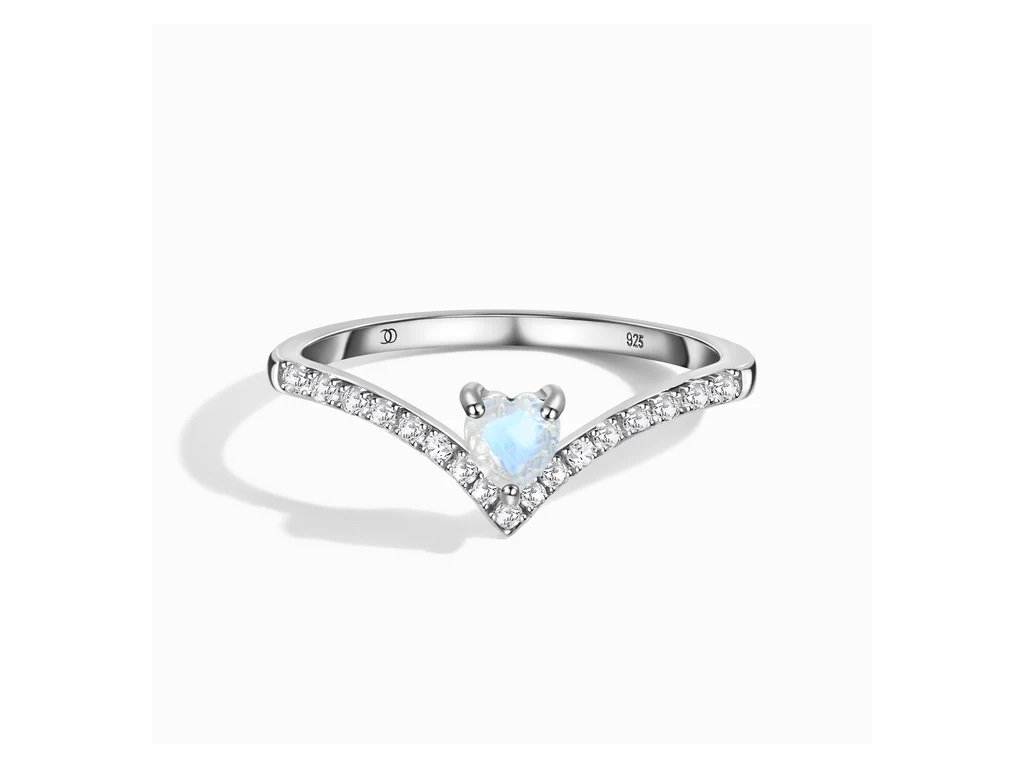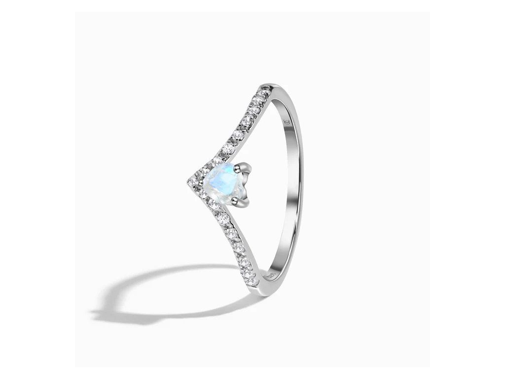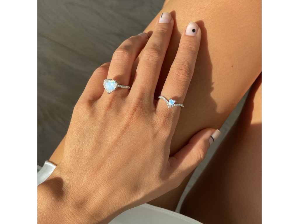 Náš autentický prsteň s názvom "Jeden pre mňa" Vám určite vyrazí dych. Mesačný kameň v tvare srdca elegantne spočíva vo vnútri štíhleho pásika v tvare písmena "V" zvýrazneného skutočným bielym trblietavým drahokamom topazom.