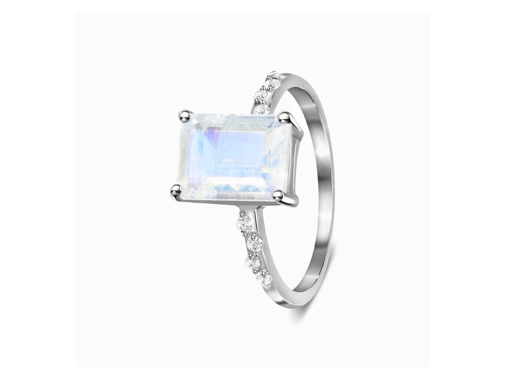 - Luxusný strieborný rhodiovaný prsteň Kráľovná obohatený mesačným dúhovým drahokamom Moonstonom a čírymi trblietavými drahokamami topazmi.
