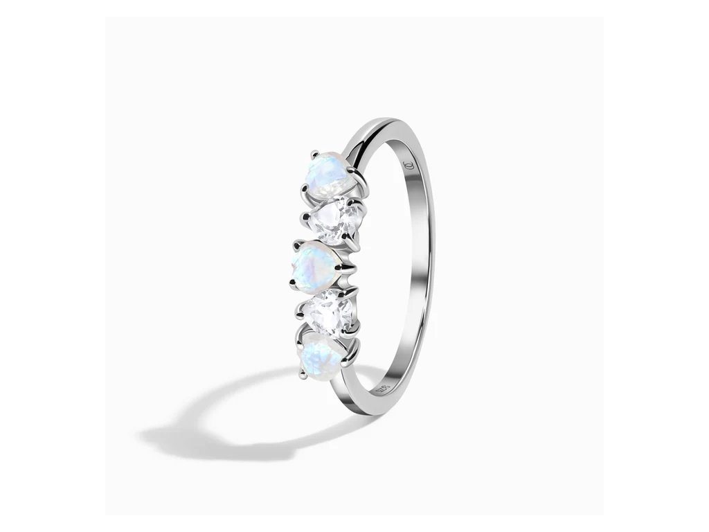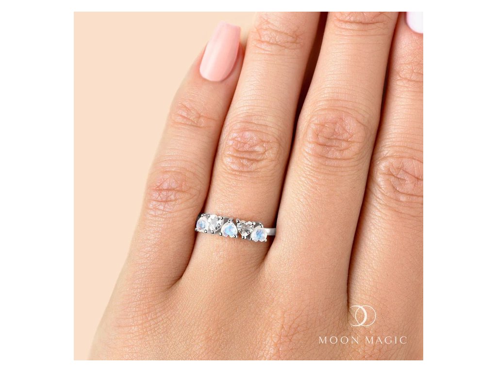 Pocíťte lásku trikrát s naším autentickým prsteňom s drahokamami Moonstony. Naše žiarivé mesačnými kameňmi v tvare srdca orámované skutočným bielym drahokamom topazom vás zaručene uchvátia.