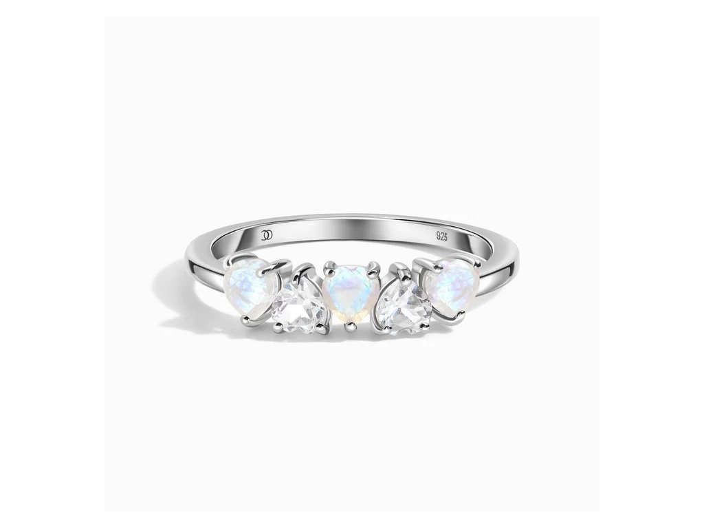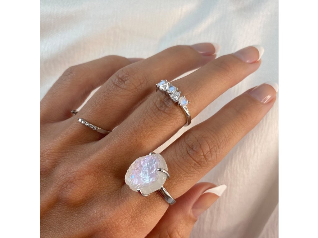 - Luxusný strieborný rhodiovaný prsteň Láska obohatený mesačnými dúhovými drahokamami Moonstony a čírymi trblietavými drahokamami topazmi v tvare milovaných sŕdc. Originálny dizajn prsteňa, kvalitné spracovanie a materiál, ručne dohotovené.