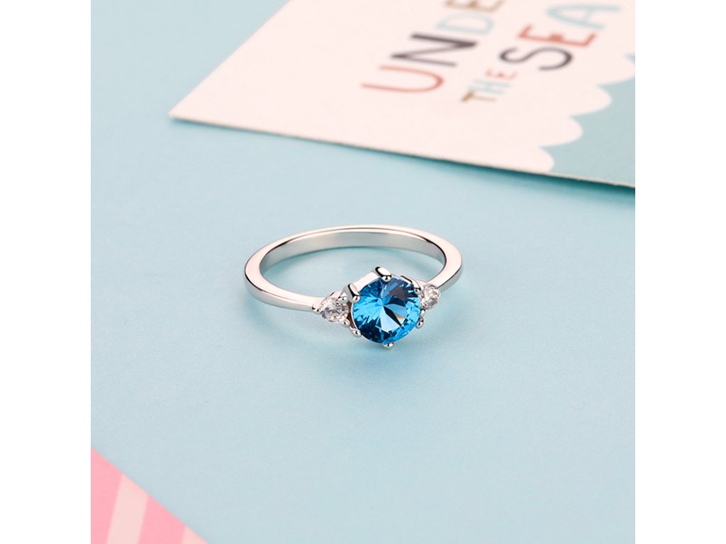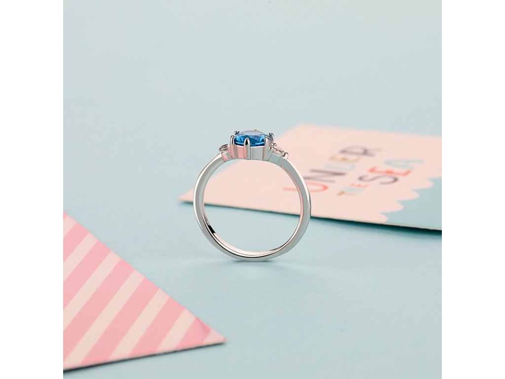 - Strieborný rhodiovaný prsteň v elegantnom dizajne zdobený veľkým modrým syntetickým zafírom a čírymi trblietavými zirkónmi. Originálny dizajn prsteňa, kvalitné spracovanie a materiál, ručne dohotovené.