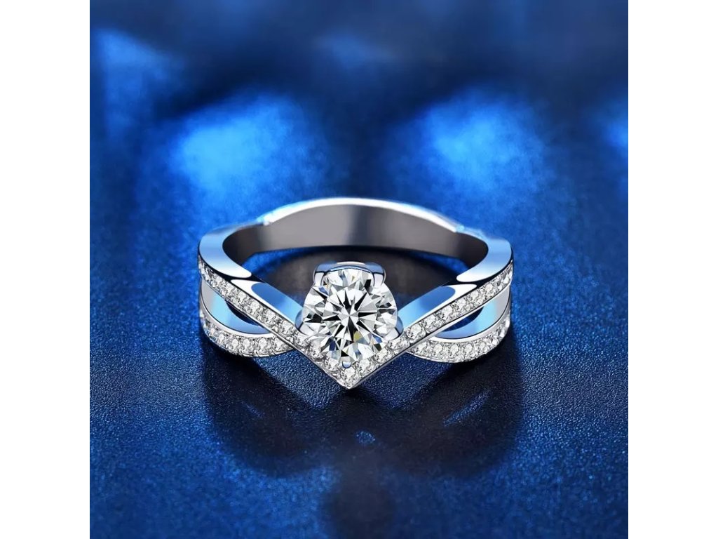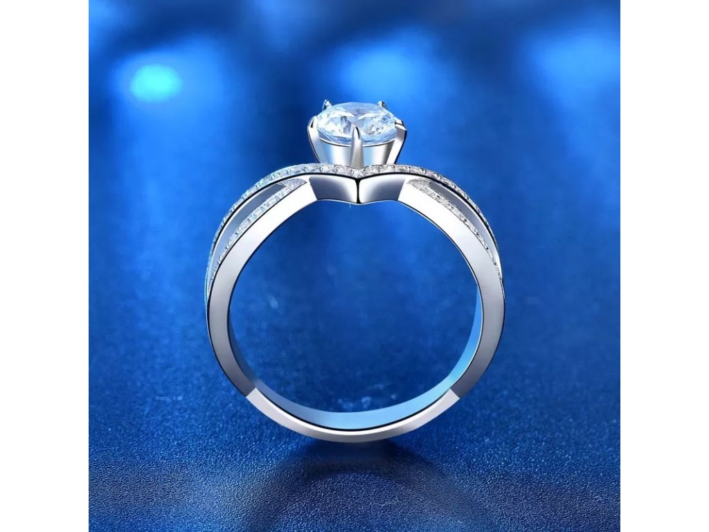 • Strieborný rhodiovaný prsteň zdobený žiarivým drahokamom moissanitom a okolitými trblietavými zirkónmi. Originálny dizajn prsteňa, kvalitné spracovanie a materiál, ručne dohotovené.