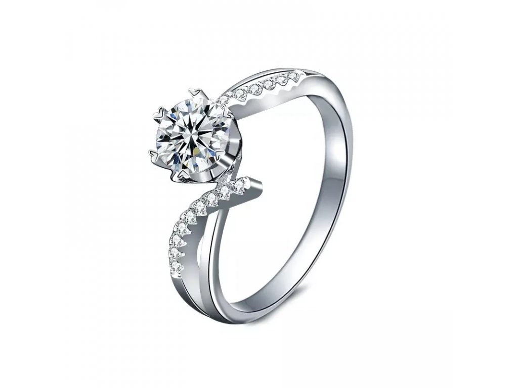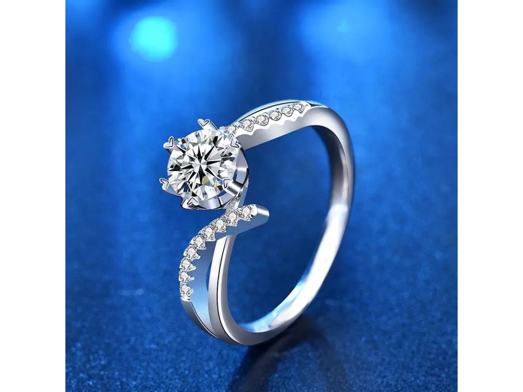 • Strieborný rhodiovaný prsteň zdobený žiarivým drahokamom moissanitom a okolitými trblietavými zirkónmi. Originálny dizajn prsteňa, kvalitné spracovanie a materiál, ručne dohotovené.