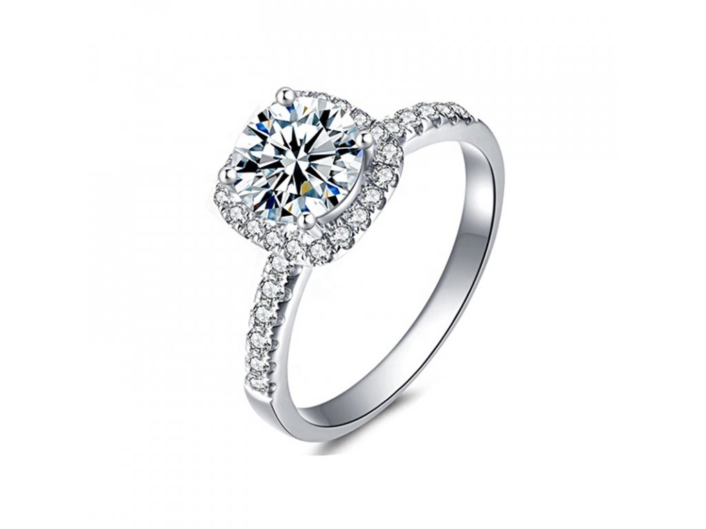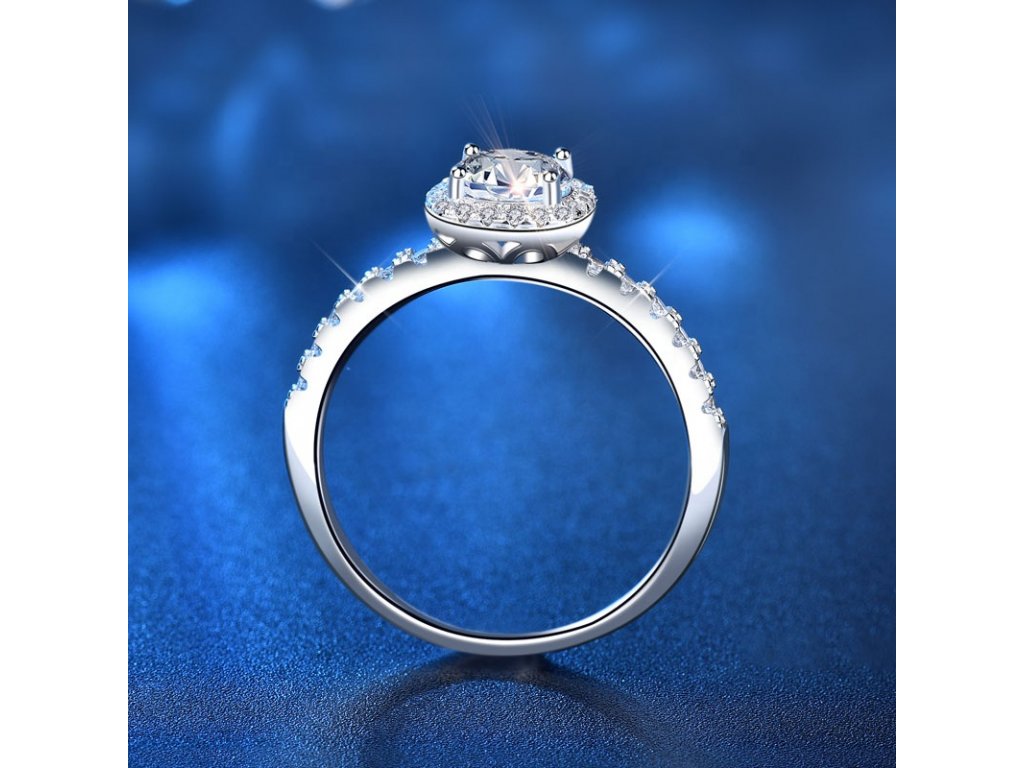 • Strieborný rhodiovaný prsteň zdobený žiarivým drahokamom moissanitom a okolitými trblietavými zirkónmi. Originálny dizajn prsteňa, kvalitné spracovanie a materiál, ručne dohotovené.