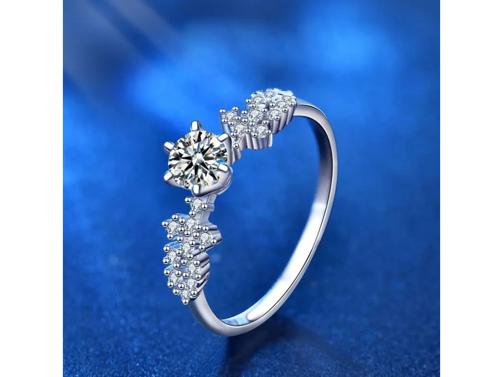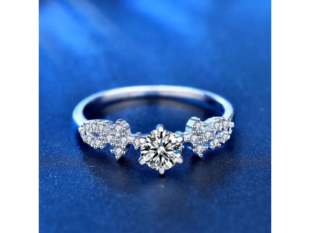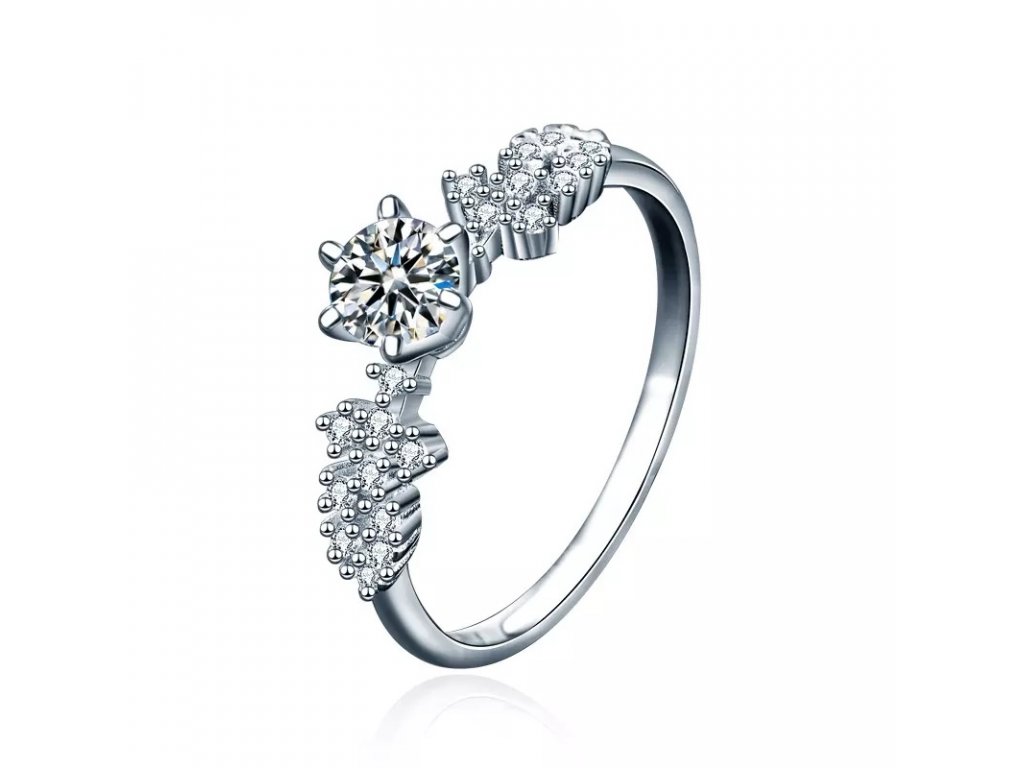 • Strieborný rhodiovaný prsteň zdobený žiarivým drahokamom moissanitom a okolitými trblietavými zirkónmi. Originálny dizajn prsteňa, kvalitné spracovanie a materiál, ručne dohotovené.
