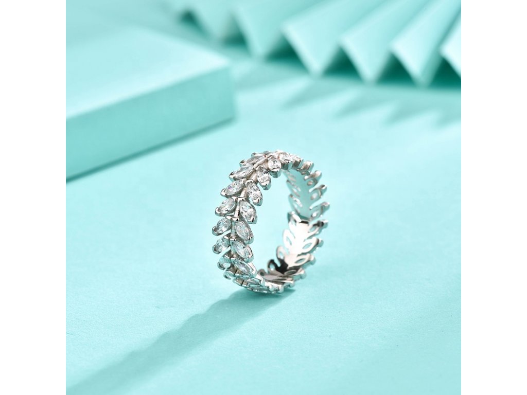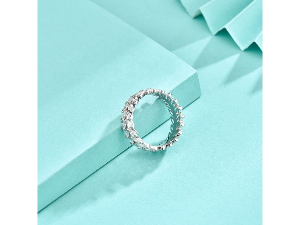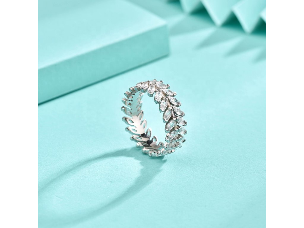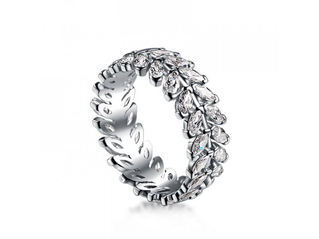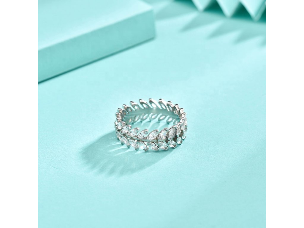 - Strieborný rhodiovaný prsteň v dizajne lístkov zdobených čírymi trblietavými zirkónmi po celom svojom obvode. Originálny dizajn prsteňa, kvalitné spracovanie a materiál, ručne dohotovené.
