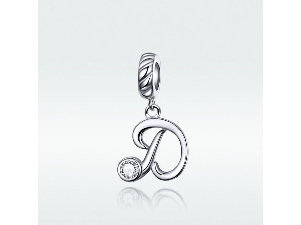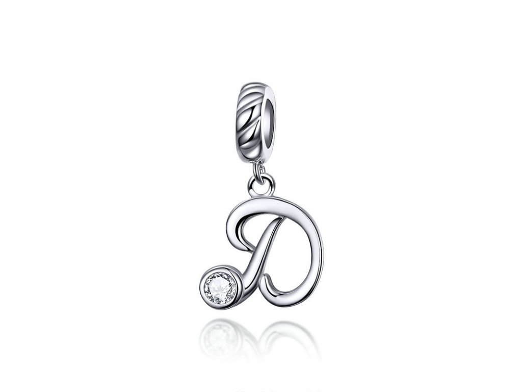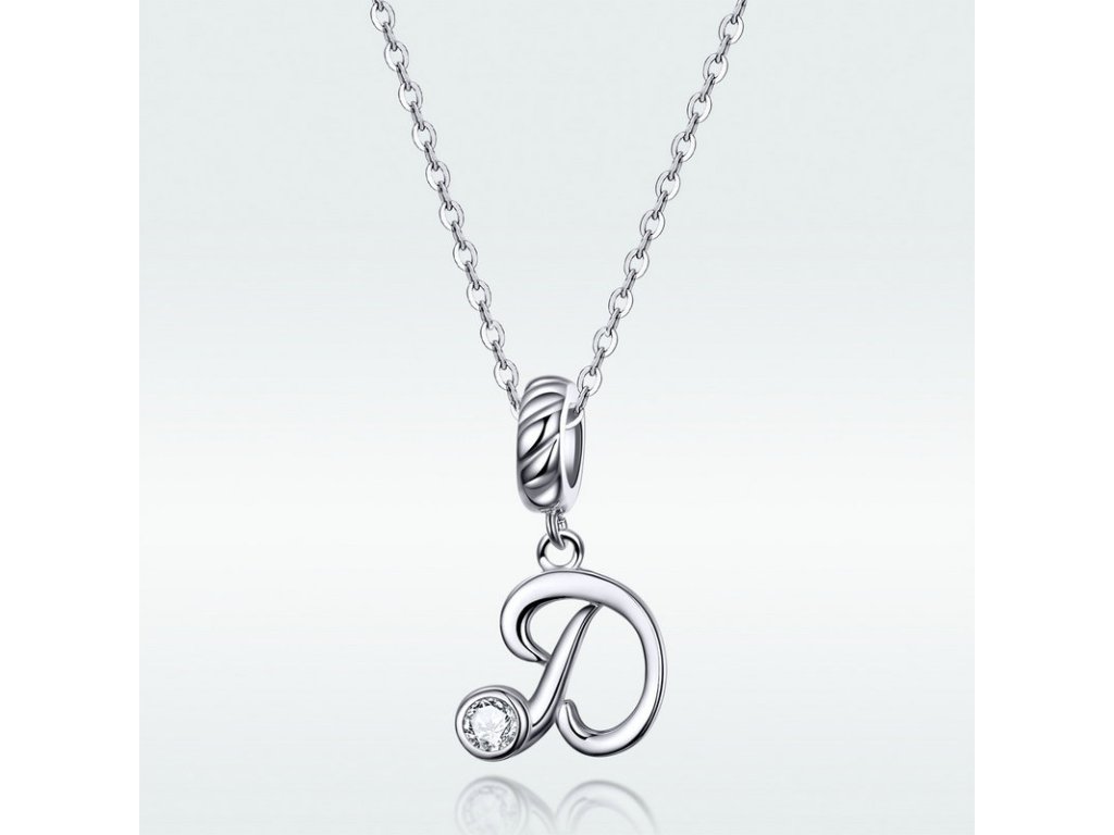 Strieborný visiaci prívesok v dizajne písacieho písmenka "D" zdobeného čírym zirkónom. Originálny design prívesku, kvalitné spracovanie a materiál, ručne dohotovené.