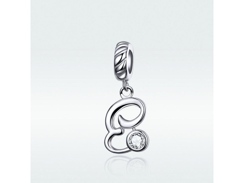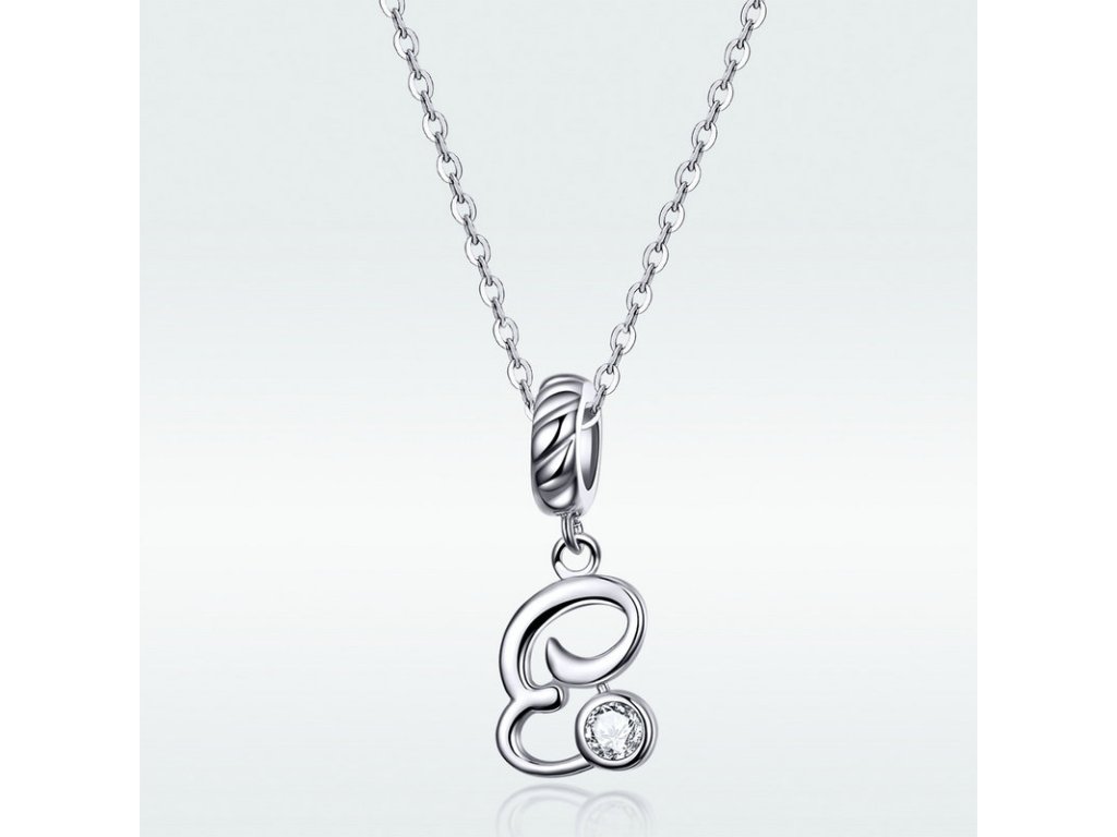 Strieborný visiaci prívesok v dizajne písacieho písmenka „E“ zdobeného čírym zirkónom. Originálny design prívesku, kvalitné spracovanie a materiál, ručne dohotovené.