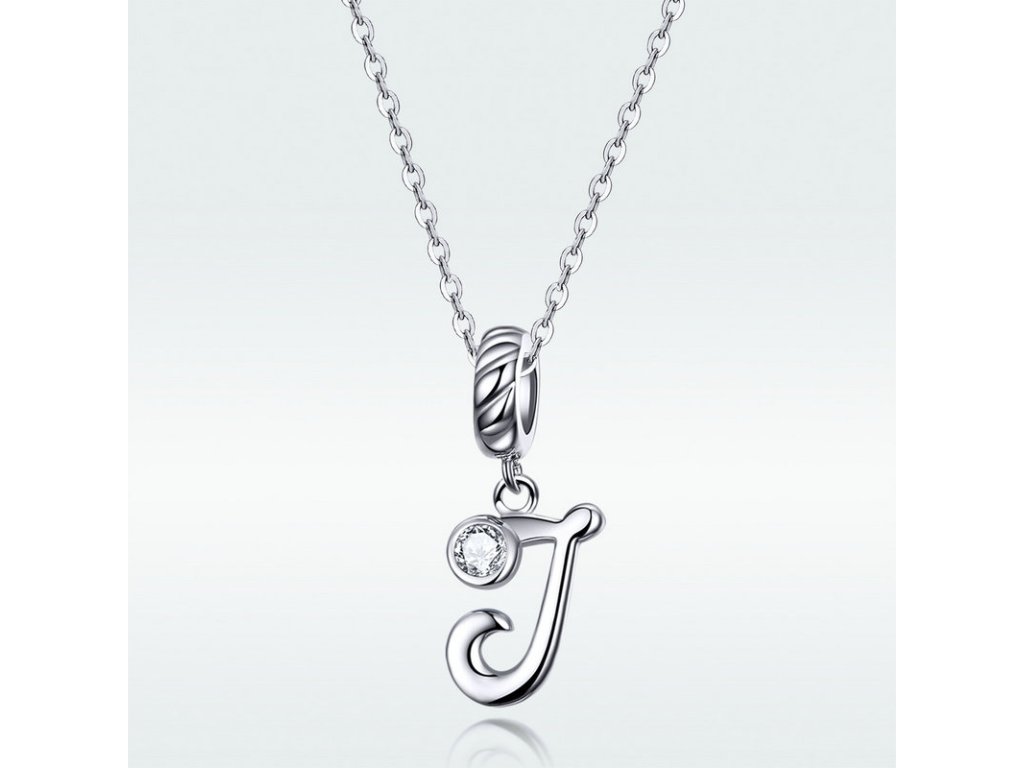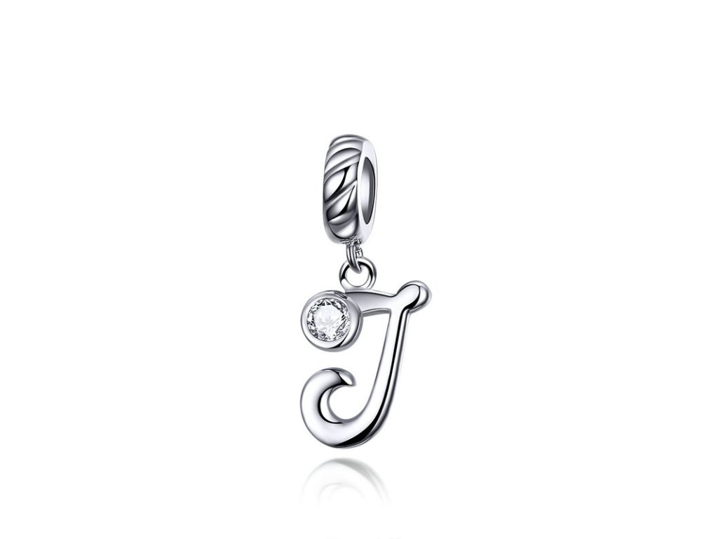 Strieborný visiaci prívesok v dizajne písacieho písmenka "J" zdobeného čírym zirkónom. Originálny design prívesku, kvalitné spracovanie a materiál, ručne dohotovené.
