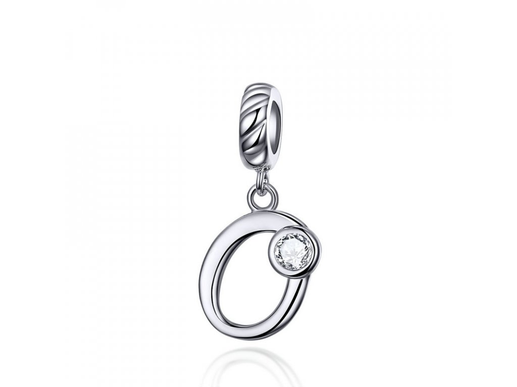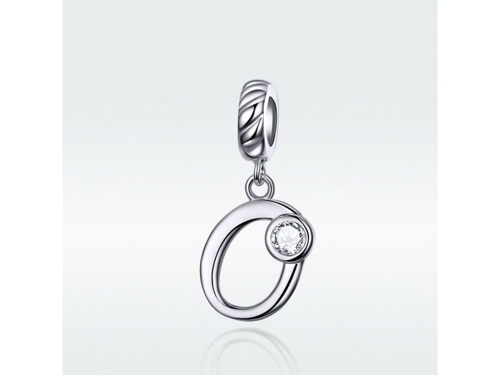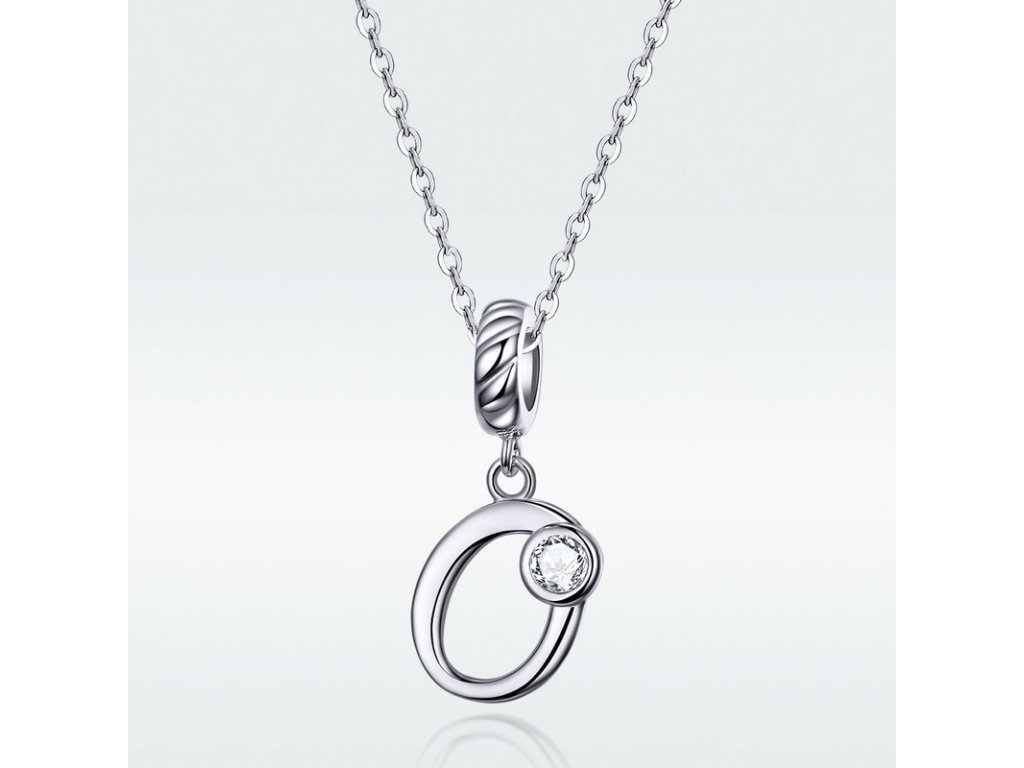 Strieborný visiaci prívesok v dizajne písacieho písmenka "O" zdobeného čírym zirkónom. Originálny design prívesku, kvalitné spracovanie a materiál, ručne dohotovené.