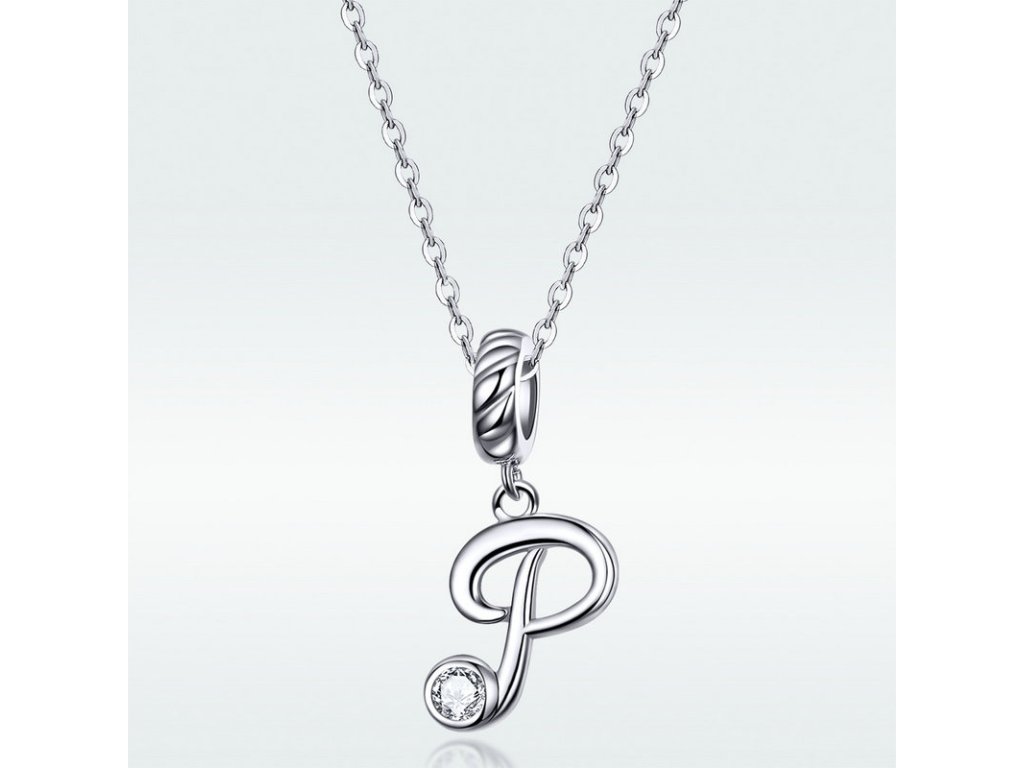 Strieborný visiaci prívesok v dizajne písacieho písmenka "P" zdobeného čírym zirkónom. Originálny design prívesku, kvalitné spracovanie a materiál, ručne dohotovené.