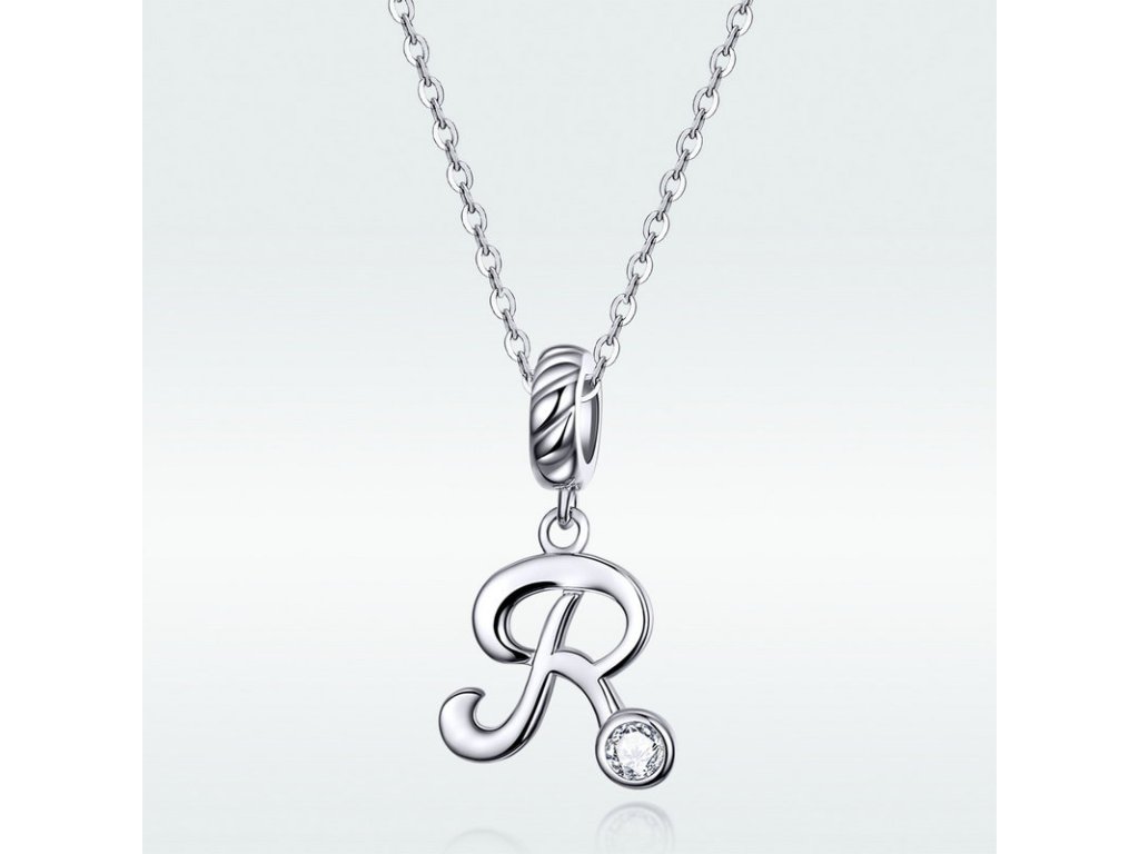 Strieborný visiaci prívesok v dizajne písacieho písmenka "R" zdobeného čírym zirkónom. Originálny design prívesku, kvalitné spracovanie a materiál, ručne dohotovené.