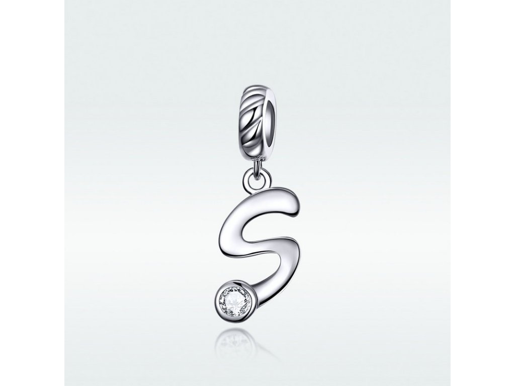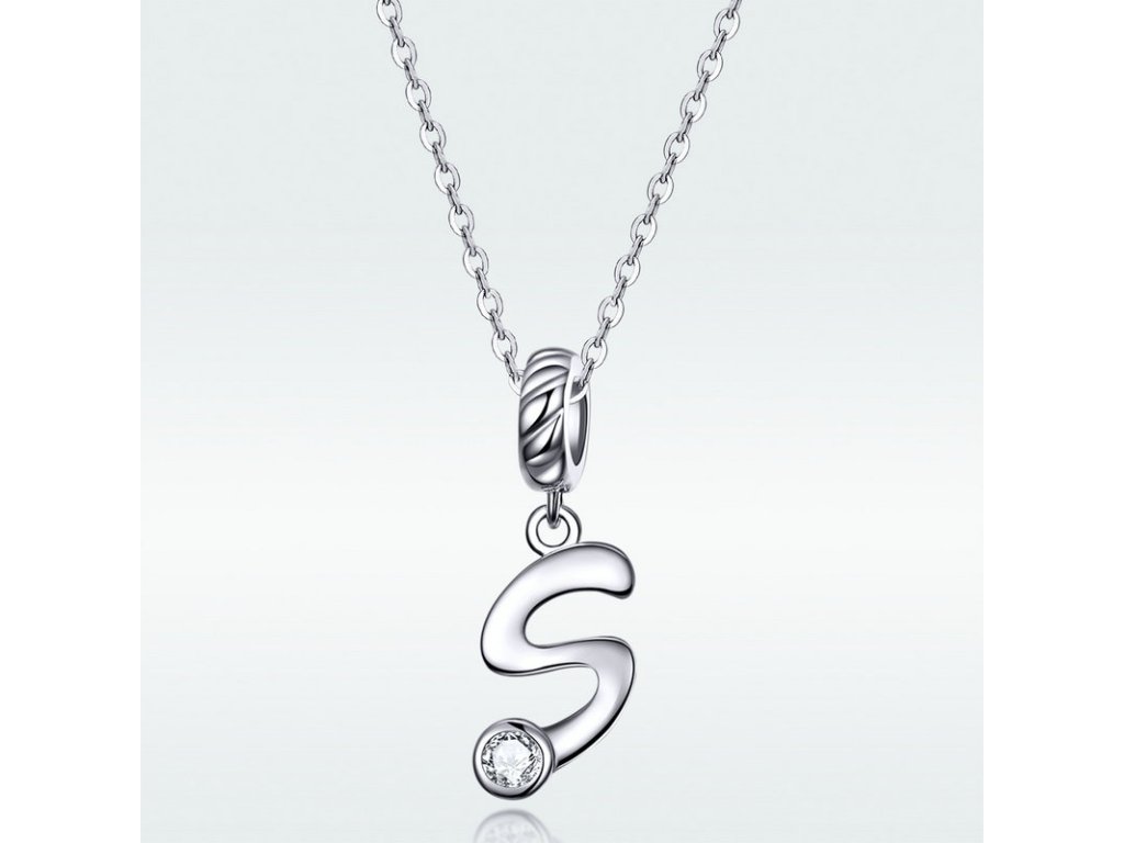Strieborný visiaci prívesok v dizajne písacieho písmenka "S" zdobeného čírym zirkónom. Originálny design prívesku, kvalitné spracovanie a materiál, ručne dohotovené.